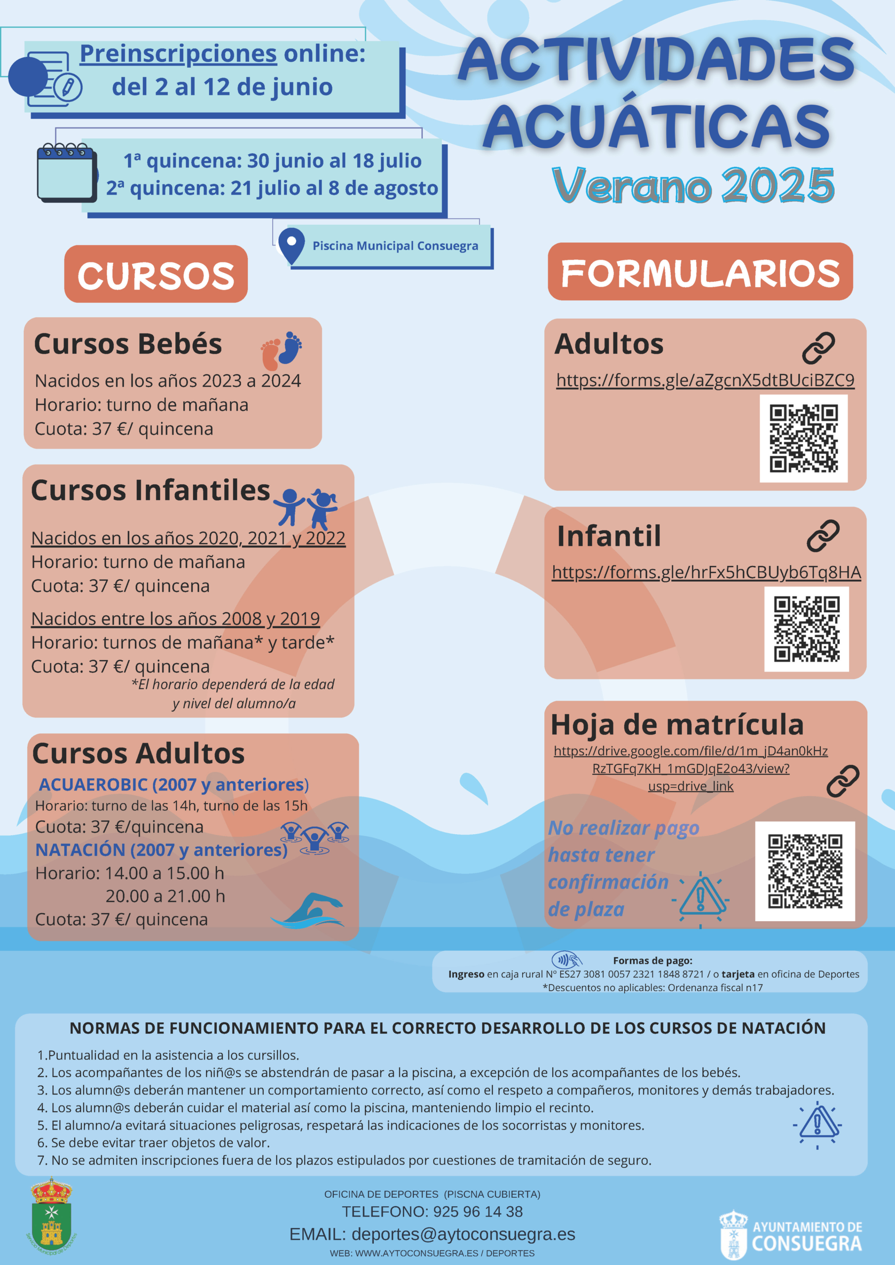Desde el Área Municipal de Deportes y Juventud del Ayuntamiento de Consuegra se publica la oferta de cursos de actividades acuáticas que van a realizarse en piscina municipal en la presente temporada estival.