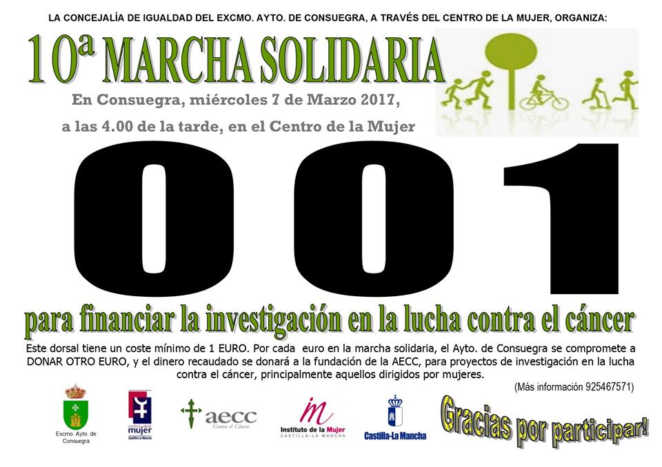 El Área Municipal de Servicios Sociales, Igualdad y Educación del Ayuntamento de Consuegra, a través del Centro de la Mujer, con motivo de la celebración del DÍA INTERNACIONAL DE LA MUJER 2018 (8 de marzo), organiza la 10ª MARCHA SOLIDARIA.