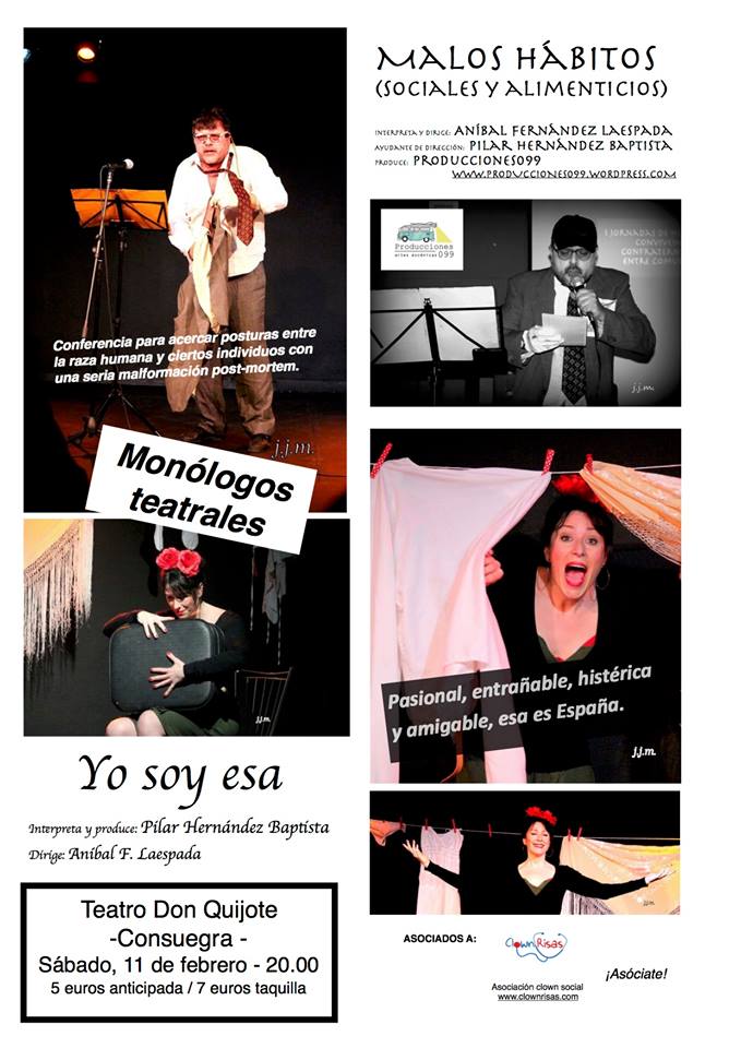 TEATRO DON QUIJOTE DE CONSUEGRA Sábado 11 de febrero de 2017 a las 20:00 horas Entrada: 5 € anticipada y 7 € mismo día Monólogos Teatrales Producciones 099 + Info.