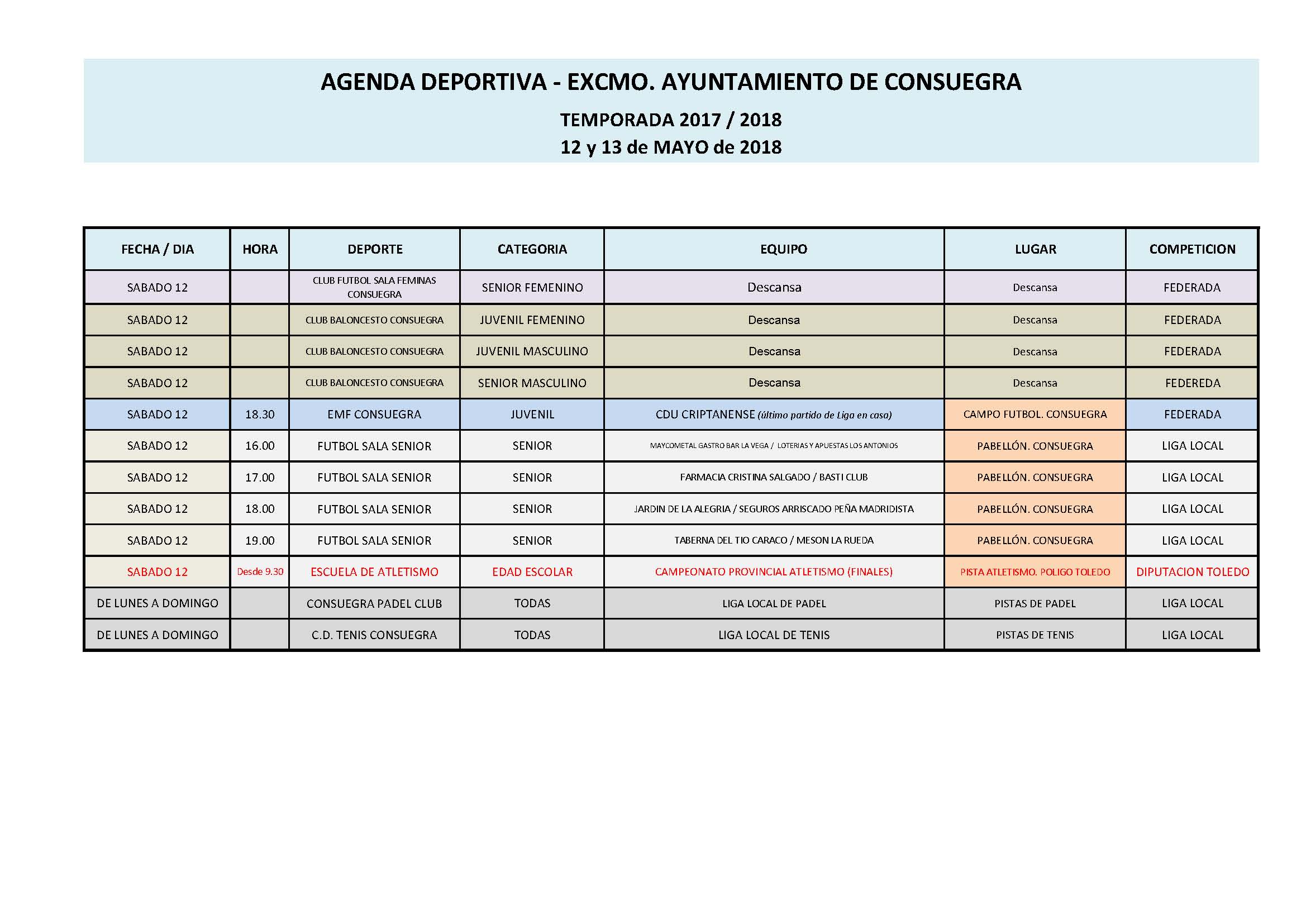 12MayTodo el día13Agenda Deportiva 12 y 13 de mayo
