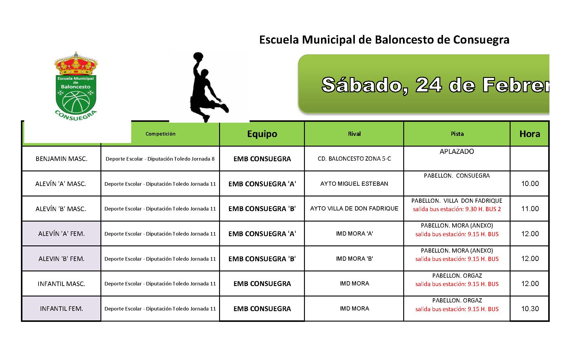 Programación de la Escuela Municipal de Baloncesto durante la joranda del sábado 24 de febrero de 2018