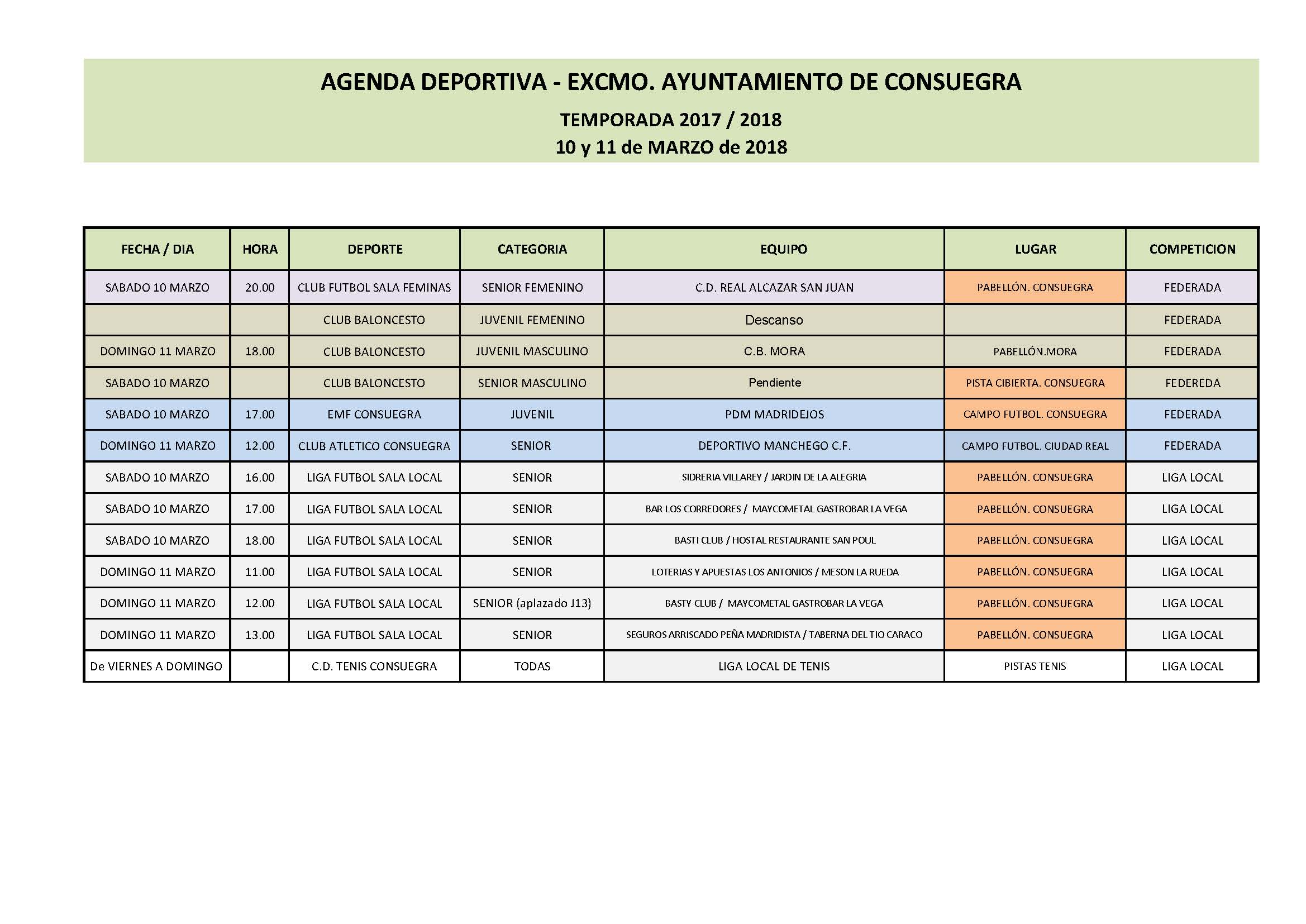 Agenda Deportiva Jornada 10 y 11 de marzo