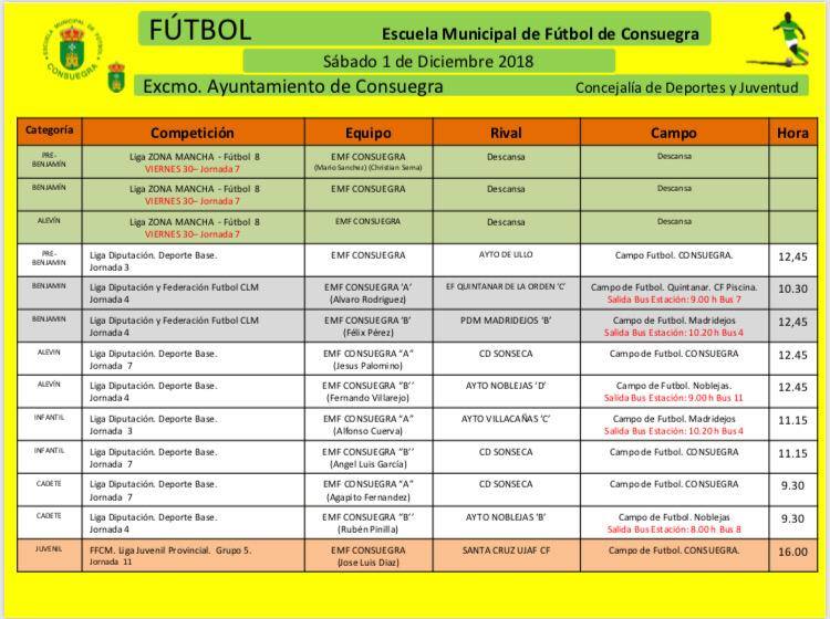Agenda Deportiva. Temporada 2018-2019 Escuela Municipal de Fútbol de Consuegra. Jornada del sábado 1 de DICIEMBRE de 2018