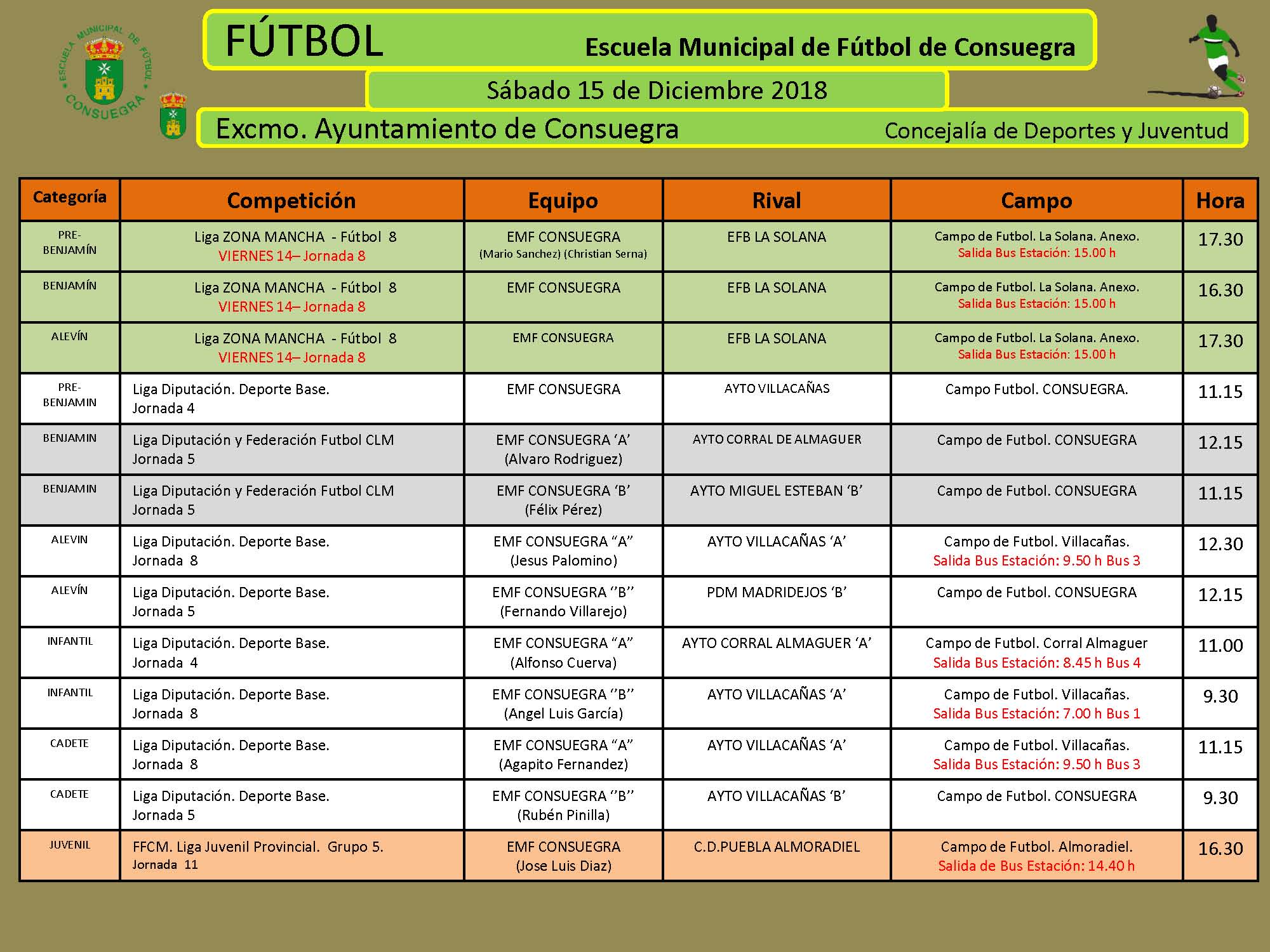 Agenda Deportiva. Temporada 2018-2019 Escuela Municipal de Fútbol de Consuegra. Jornada del sábado 15 de DICIEMBRE de 2018