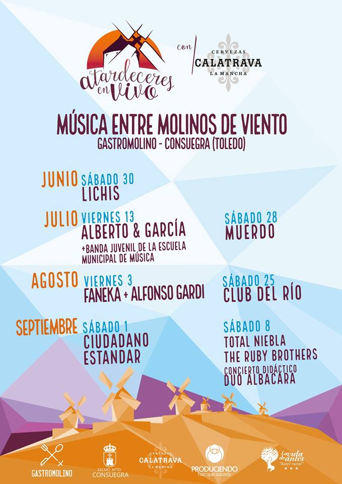 Los molinos (que han vivido un proceso de rehabilitación exprés tras el temporal del pasado mes de Marzo) acogerán siete conciertos gratuitos entre los meses de julio y septiembre con figuras como Miguel Ángel Hernando (Lichis) o Club del Río. El patrocinio cultural de Calatrava , cerveza originaria de Ciudad Real, ha permitido al evento crecer en medios y proyección.