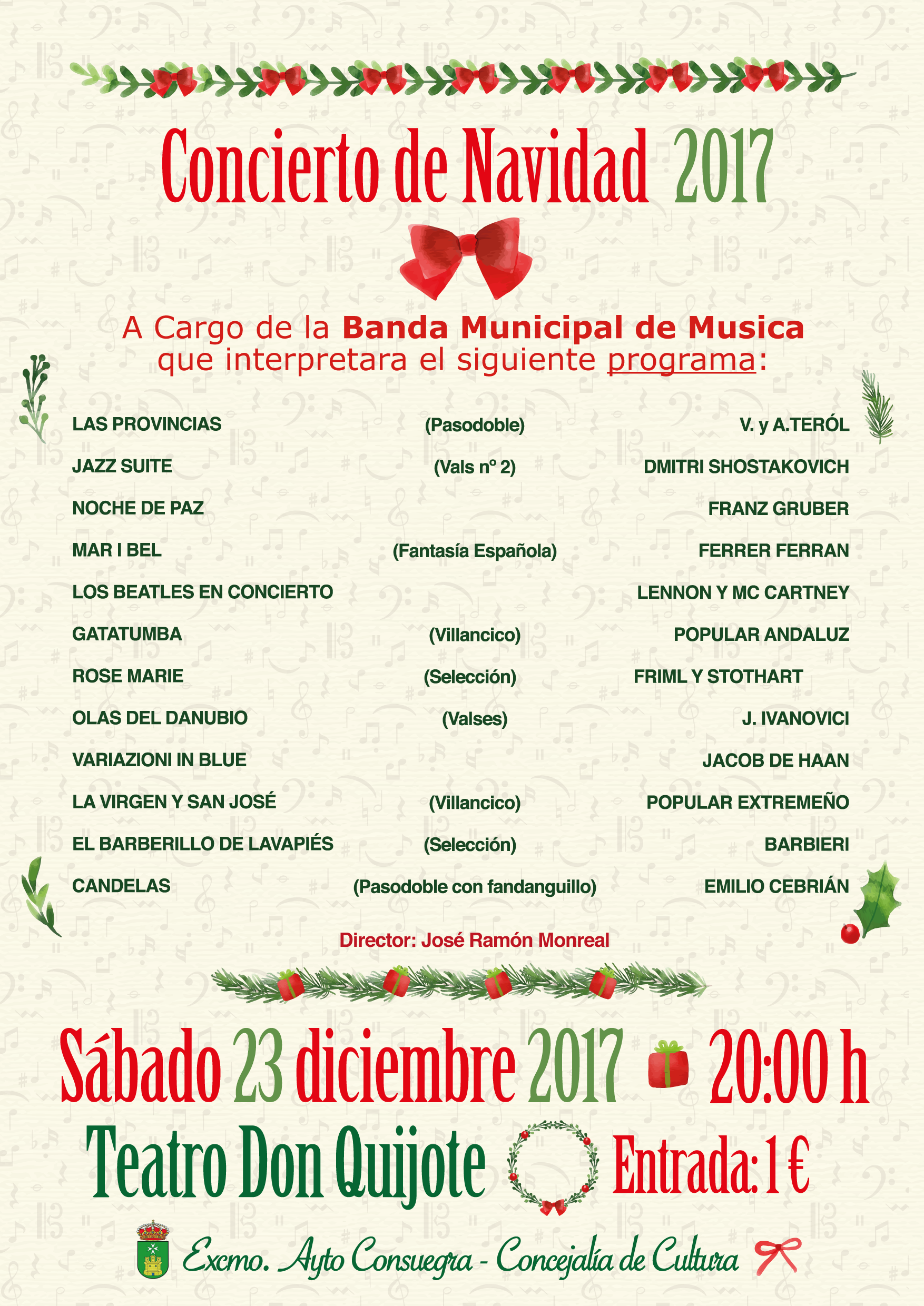 TEATRO DON QUIJOTE DE CONSUEGRA Sábado 23 de diciembre de 2017 a las 20:00 horas Entrada: 1€ Concierto de Navidad a cargo de la BandaMunicipal de Música de Consuegra Dirección: Jose Ramón Monreal Venta de
