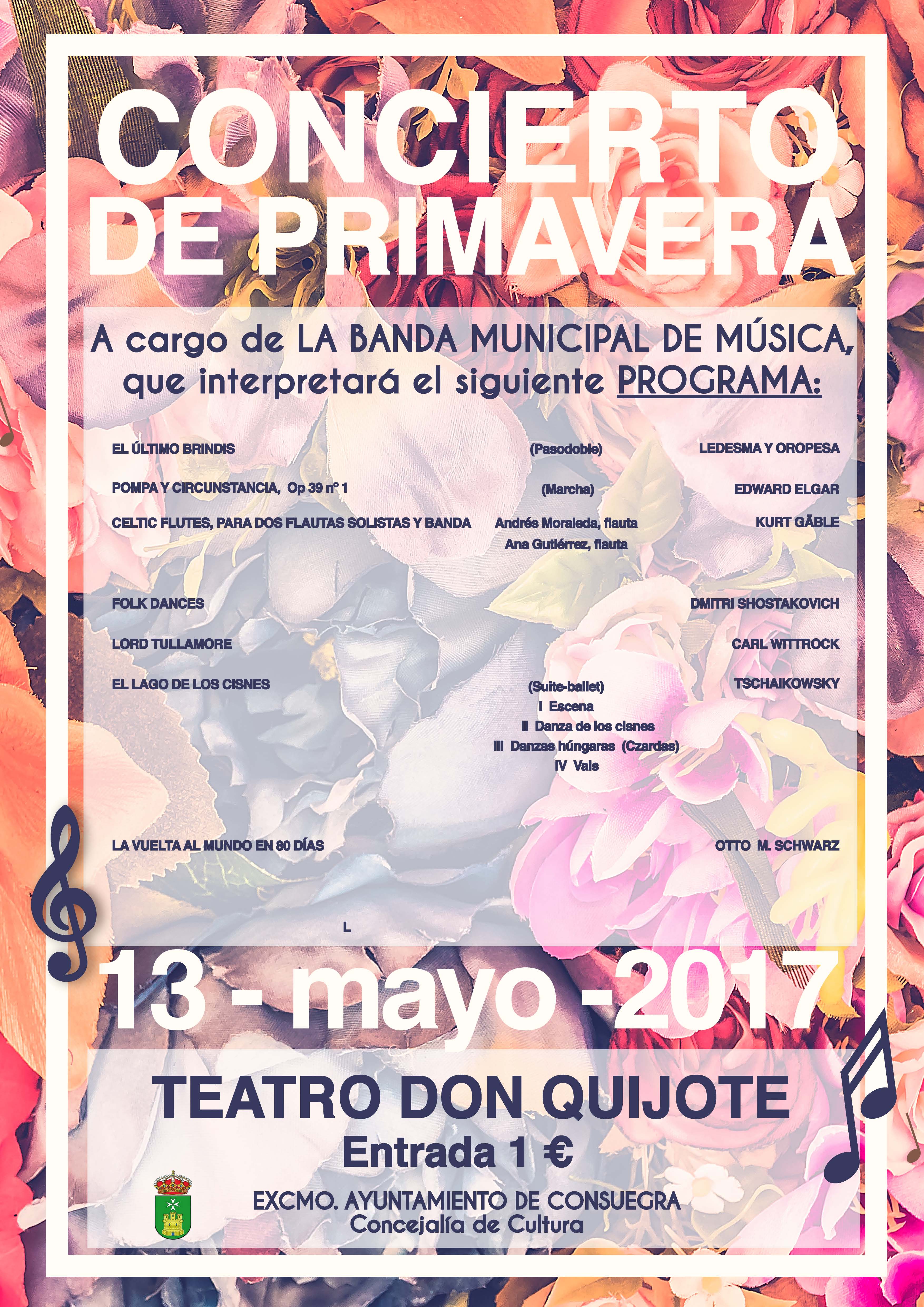 TEATRO DON QUIJOTE DE CONSUEGRA Sábado 13 de mayo de 2017, a las 20:30 h Entrada: 1 € Concierto de Primavera a cargo de la Banda Municipal de Música de