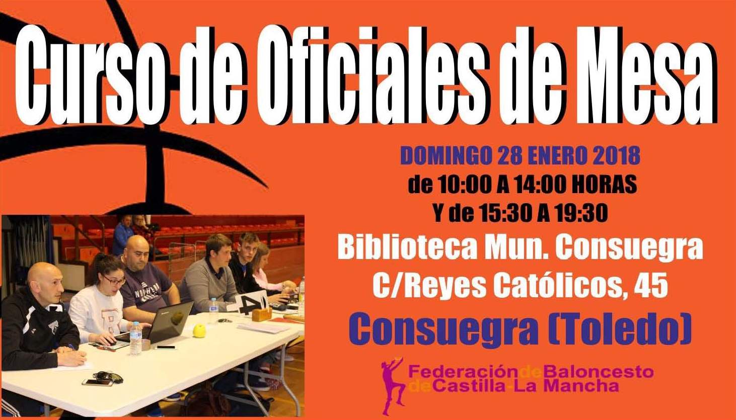 La Federación de Baloncesto de Castilla-La Mancha, con la colaboración del Ayuntamiento de Consuegra, imparte CURSO DE OFICIALES DE MESA el próximo 28 de enero de 2018, de 10:00 a 14:00 horas, y de 15:30 a 19:30 horas, en Biblioteca Pública Municipal de Consuegra (C/ Reyes Católicos, 4).