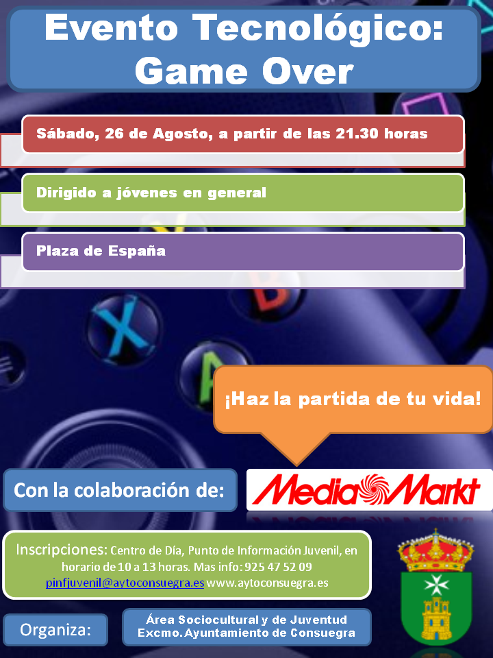 El Área Sociocultural y Juventud del Ayuntamiento de Consuegra, presenta las actividades y eventos programados con motivo de la SEMANA DE LA JUVENTUD 2017: Evento tecnológico: Game Over Fecha: