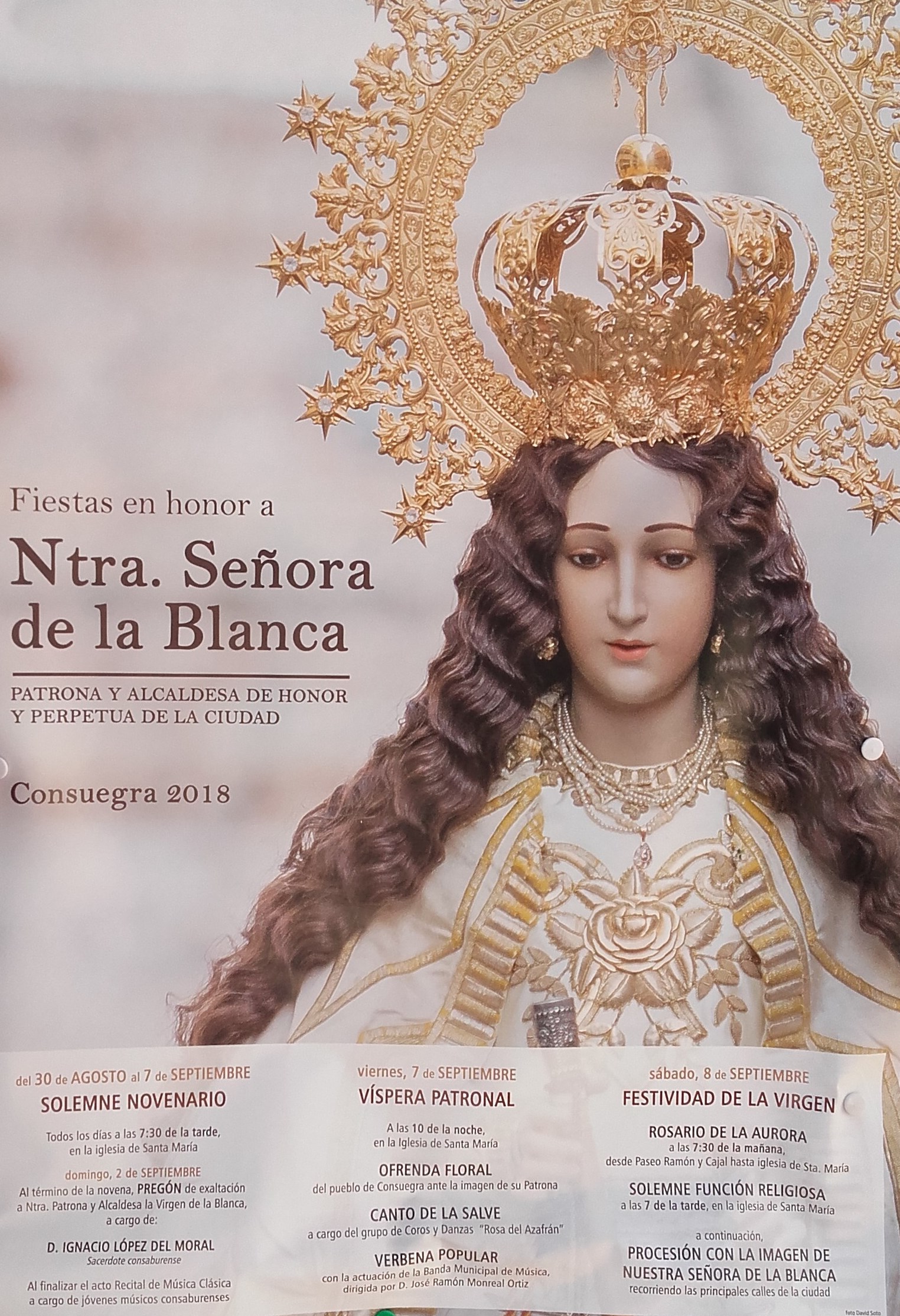 El día 8 septiembre tendrá lugar la festividad de la virgen con solemne función religiosa en la Iglesia de Santa Maria a las 19.00h y a continuación la procesión con la imagen de Ntra. Sra de la Blanca, recorriendo las principales calles de la ciudad.