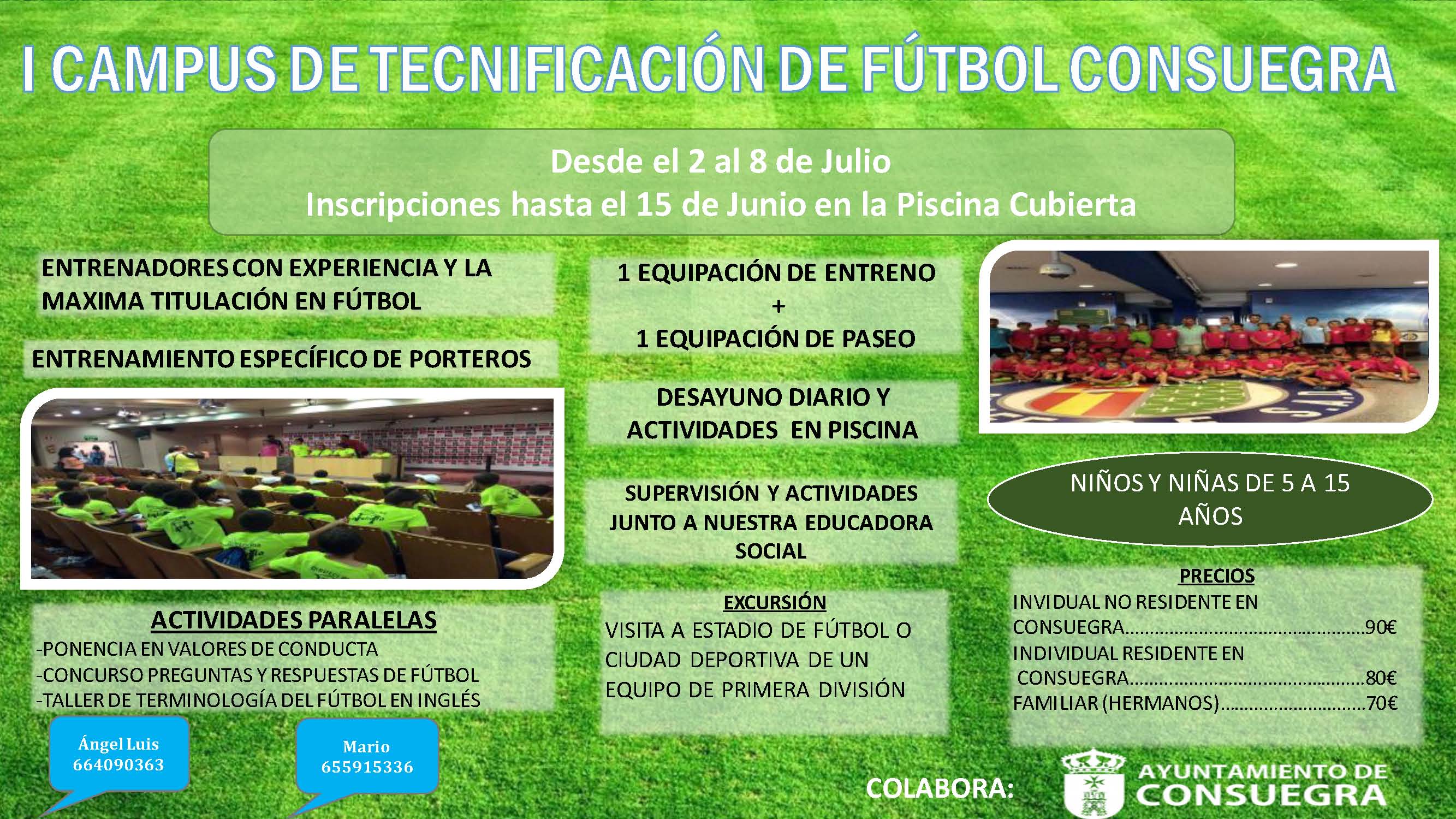 El Área Municipal de Deportes y Juventud del Ayuntamiento de Consuegra organiza CAMPUS DE TECNIFICACÓN DE FÚTBOL del 2 al 8 de julio. Precios: Individual no residente en Consuegra 90