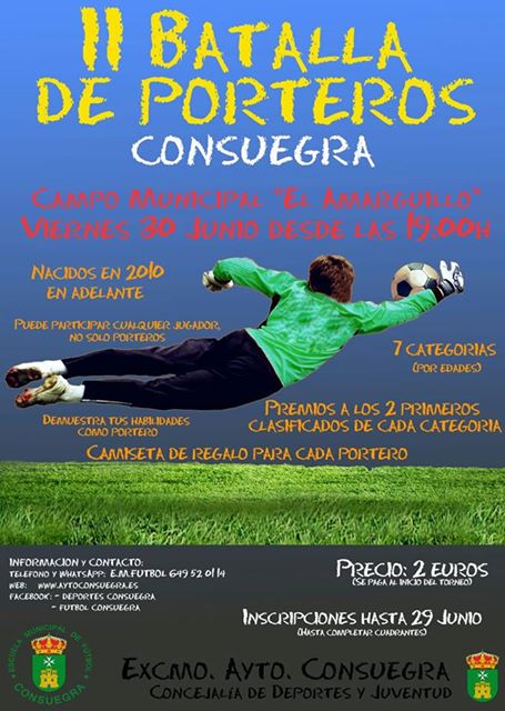 El Área Municipal de Deportes y Juventud de Consuegra, a través de la Escuela Municipal de Fútbol, organiza II Batalla de Porteros Consuegra 2017. Viernes 30 de junio, desde