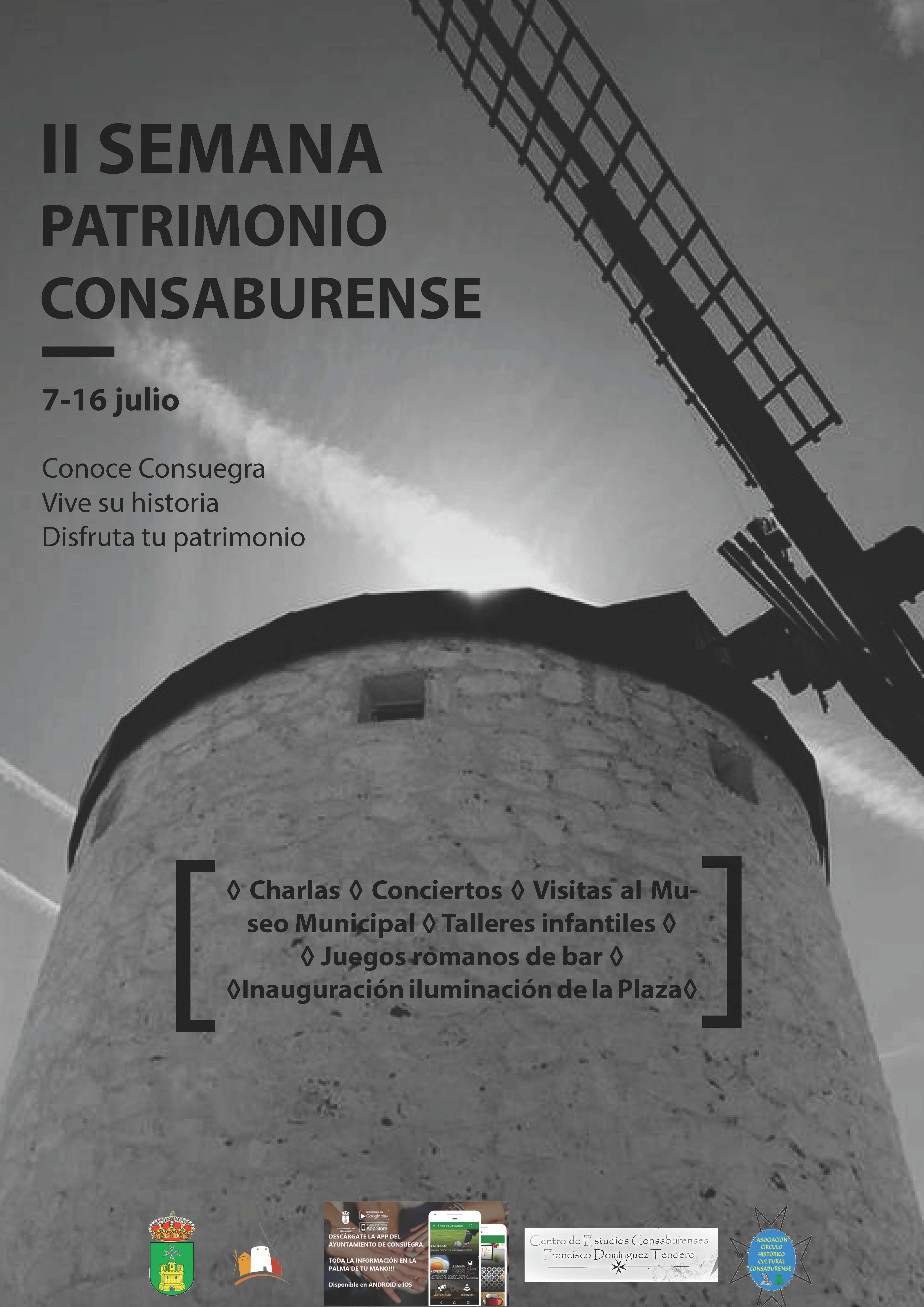 Desde las Áreas Municipales de Turismo y Cultura se presenta la programación de actividades con motivo de la II SEMANA DEL PATRIMONIO CONSABURENSE, que se celebrará del 7 al 16 de julio.