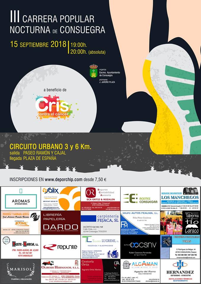 El Excmo. Ayuntamiento de Consuegra organiza III CARRERA POPULAR NOCTURNA de CONSUEGRA, el próximo 15 de septiembre de 2018, a beneficio de la FUNDACIÓN CRIS CONTRA EL CÁNCER.