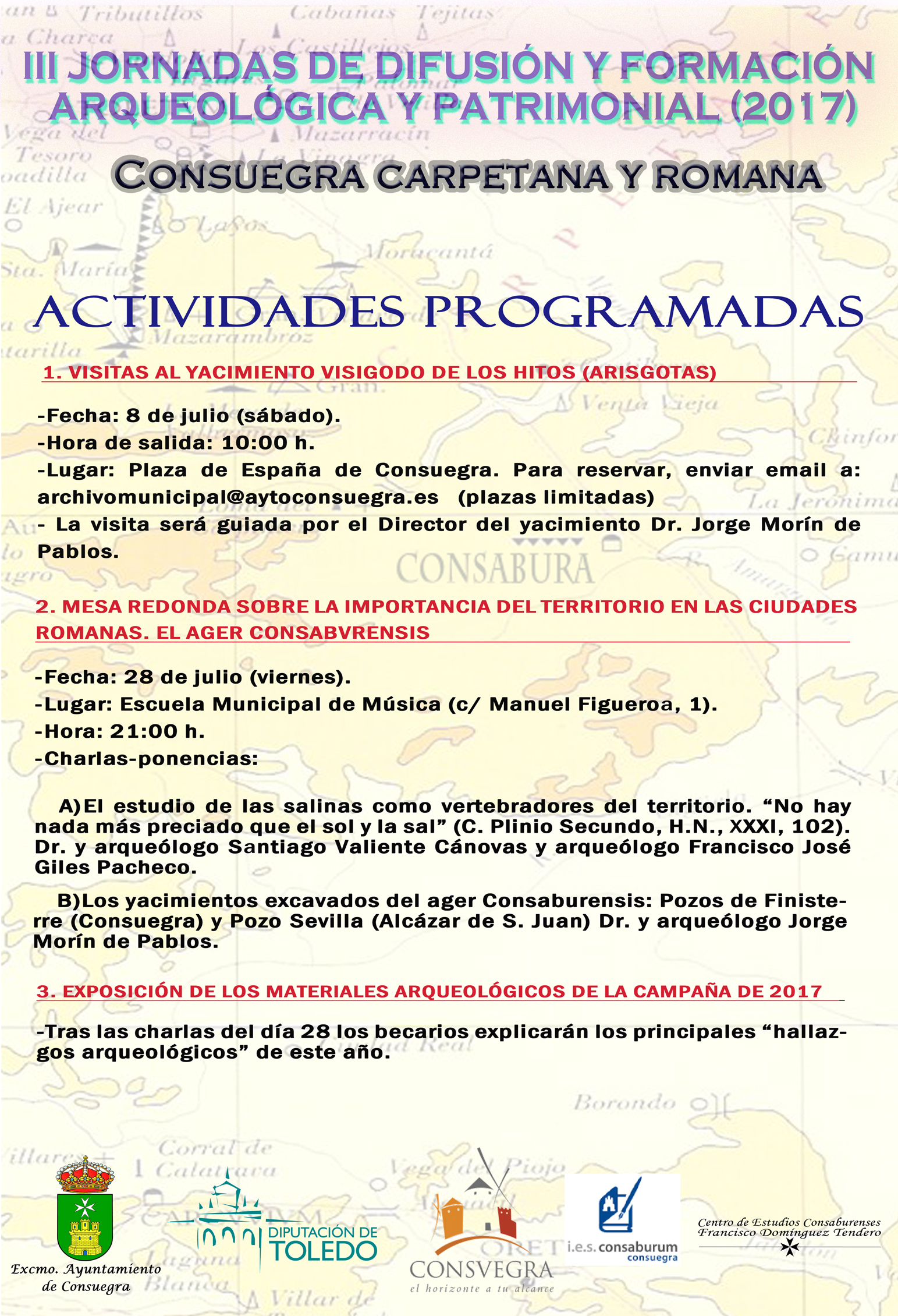 III JORNADAS DE DIFUSIÓN Y FORMACIÓN ARQUEOLÓGICA Y PATRIMONIAL 2017. CONSUEGRA CARPETANA Y ROMANA El Área Municipal de Cultura y Patrimonio presenta las siguientes actividades programadas: 1. VISITA