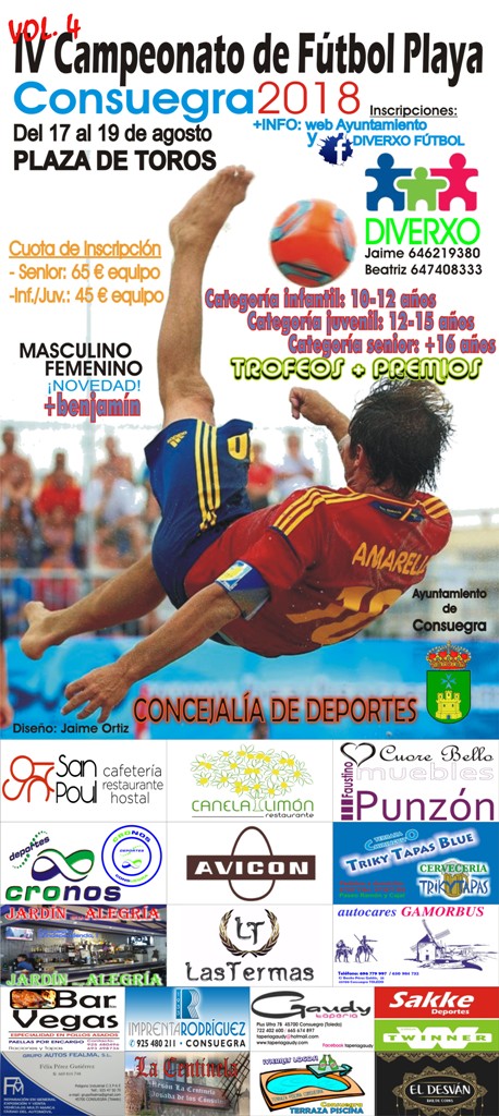 C.D. Diverxo, con la colaboración de la Concejalía de Deportes del Ayuntamiento de Consuegra, presenta: IV CAMPEONATO DE FÚTBOL PLAYA CONSUEGRA 2018 Fechas y lugar: Del 17 al