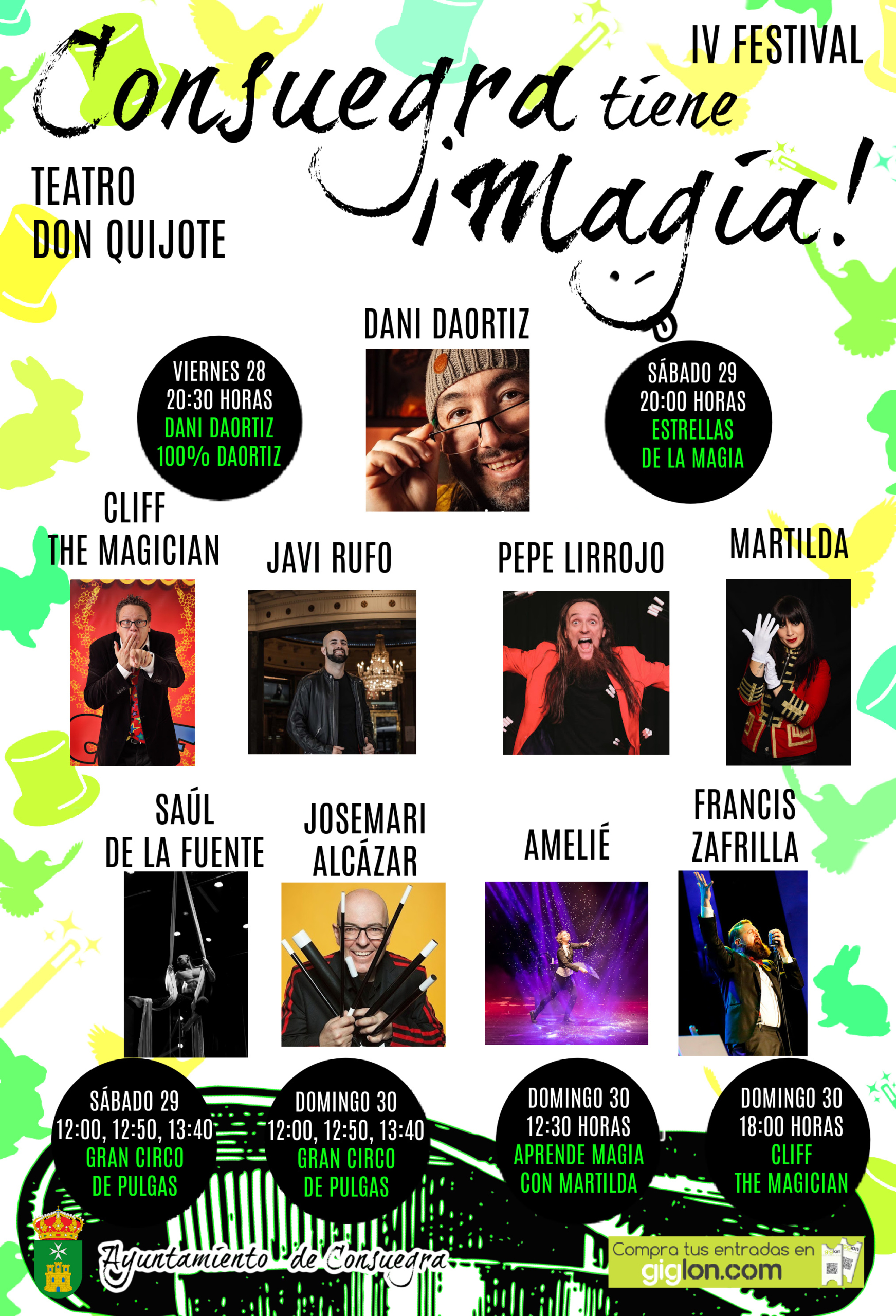 Después de un año tomando impuso, volvemos cargados de ilusión para demostrar, una vez más, que Consuegra Tiene MAGIA. Para ello hemos programado un fin de semana cargado de actividades, entre las que podrás disfrutar de los mejores magos y magas del momento. Y no solo podrás VER magia, también podrás HACER magia, incluso comer o cenar con magos y magas… el caso es que renueves tu ilusión y salgas a la calle y vengas al teatro y grites con nosotros que Consuegra…
