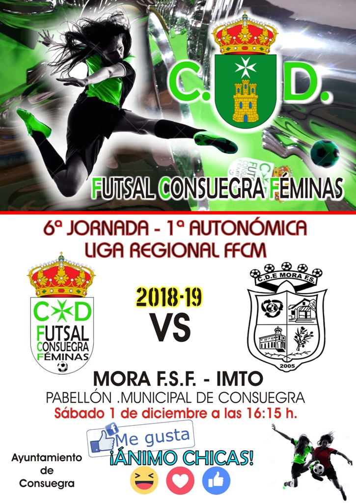 FUTSAL FEMINAS 6ª JORNADA – 1ª AUTONÓMICA (Liga Regional FFCM). Temporada 2018-2019 C.D. FÚTSAL CONSUEGRA FÉMINAS vs MORA F.S.F-IMTO Sábado, 1 de noviembre, a las 16:15 horas. Pabellón Municipal de Consuegra