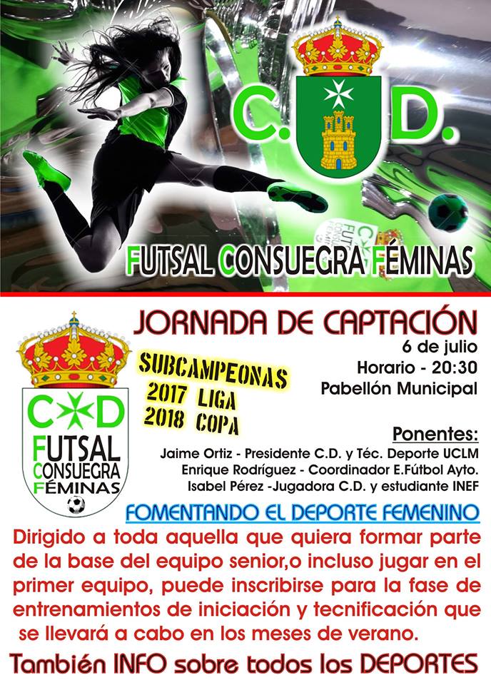 C.D. Futsal Consuegra Féminas organiza el próximo viernes 6 de julio de 2018, JORNADA DE CAPTACIÓN, a las 20:30h en el Pabellón Municipal.