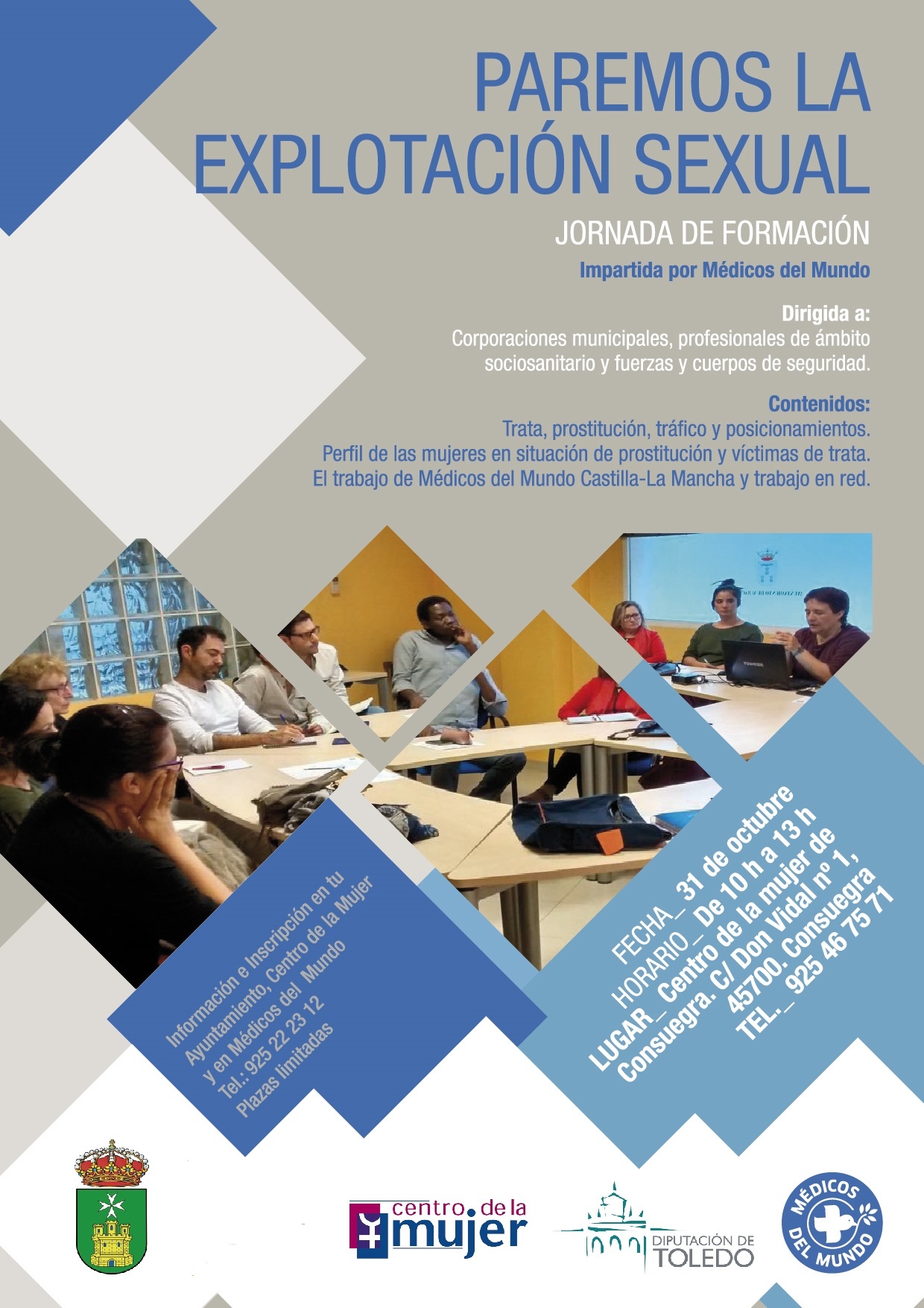 El Área Municipal de Servicios Sociales del Ayuntamiento de Consuegra, a través del Centro de la Mujer, y con la colaboración de la Diputación Provincial de Toledo, organiza jornada formativa «Paremos la explotación sexual», impartida por Médicos del Mundo y que tendrá lugar el próximo martes, 31 de octubre, de 10h a 13h en el Centro de la Mujer, tras la cual se inaugurará la exposición «Mujeres [In]visibles».