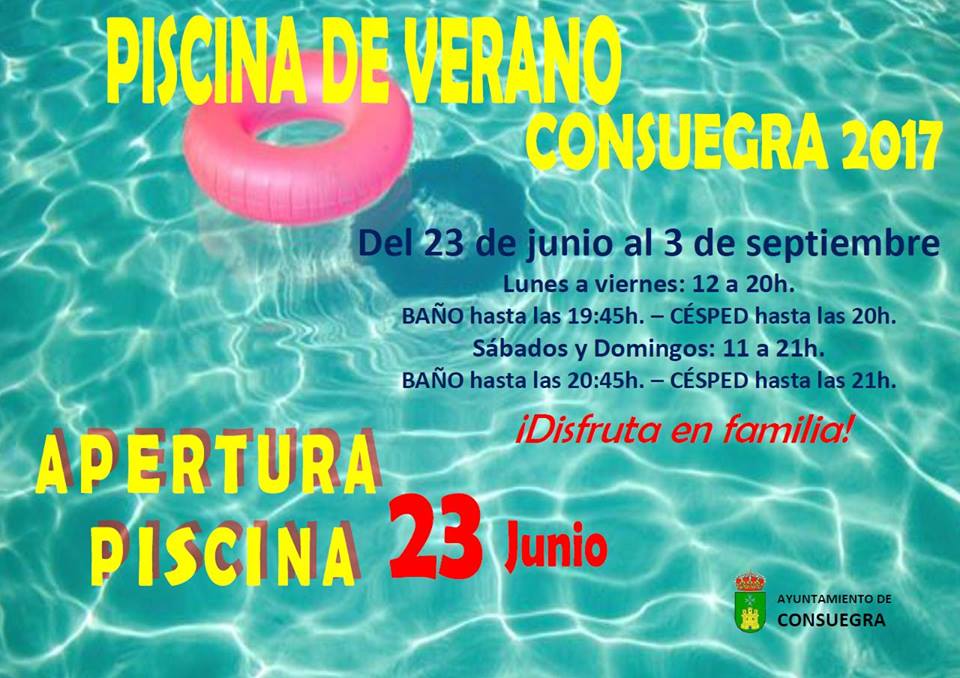PISCINA DE VERANO TEMPORADA 2017 JORNADA DE PUERTAS ABIERTAS: viernes, 23 de junio a partir de las 16:30 horas. Horarios: Lunes a viernes de 12:00 a 20:00 h. BAÑO hasta las 19:45 h –