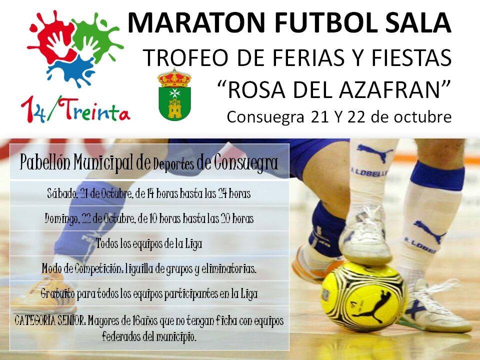 El Área Municipal de Deportes y Juventud del Ayuntamiento de Consuegra y la Asociación EPSJ 14/Treinta organizan: MARATÓN FUTBOL SALA. TROFERO FERIAS Y FIESTAS ROSA DEL AZAFRÁN Fecha: 21 y 22 de
