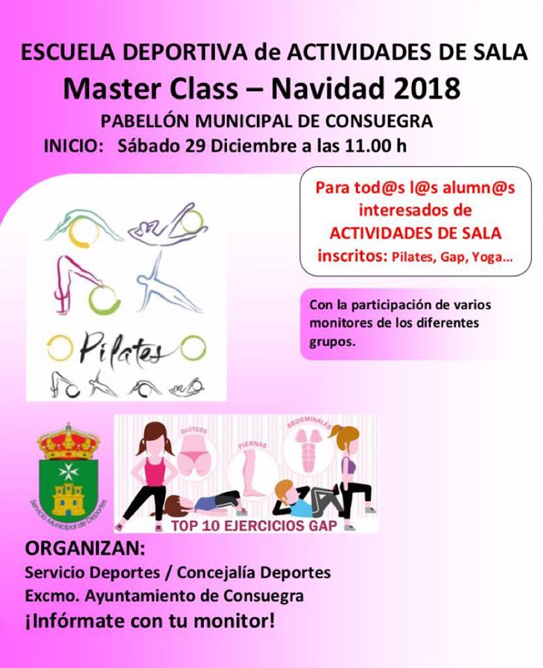 El Área Municipal de Deportes del Ayuntamiento de Consuegra, organiza MASTER CLASS NAVIDAD 2018 en el Pabellón Municipal el próximo sábado 29 de diciembre, a las 11:00 horas.