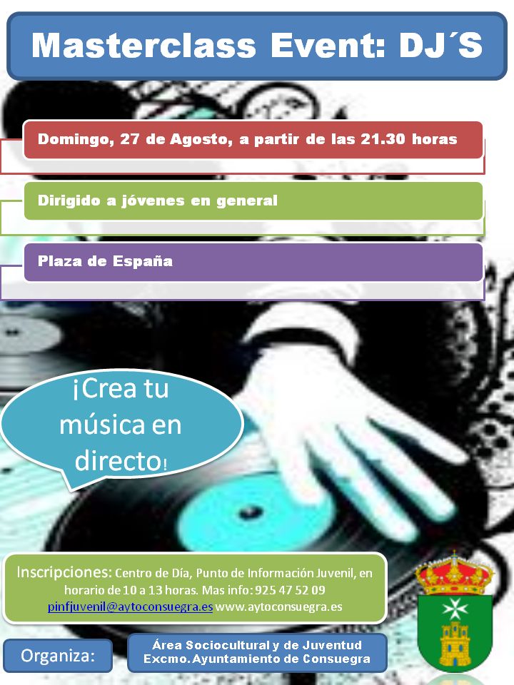 El Área Sociocultural y Juventud del Ayuntamiento de Consuegra, presenta las actividades y eventos programados con motivo de la SEMANA DE LA JUVENTUD 2017: Masterclass Event: DJ’S Fecha: Domingo 27 de