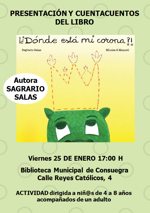 El próximo día 25 de enero a las 17:00h, en la Biblioteca Municipal, podremos disfrutar de la compañía de la autora Sagrario Salas que nos presentará su libro «¿Dónde está mi corona?».