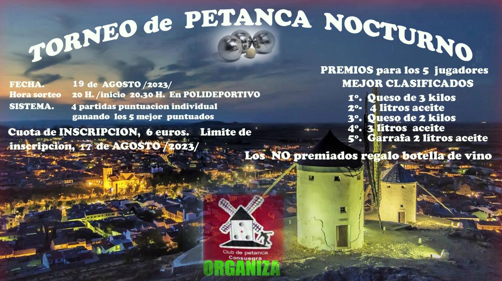 El Club de Petanca Consuegra, con la colaboración del Ayuntamiento de Consuegra, organiza Torneo de Petanca Nocturno el 19 de agosto.