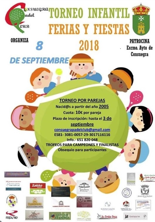 TORNEO INFANTIL DE PADEL FERIAS Y FIESTAS 2018 Sábado 8 de septiembre Gran torneo de pádel Con motivo de las fiestas patronales de Consuegra patrocinado por el Exmo. Ayuntamiento de Consuegra