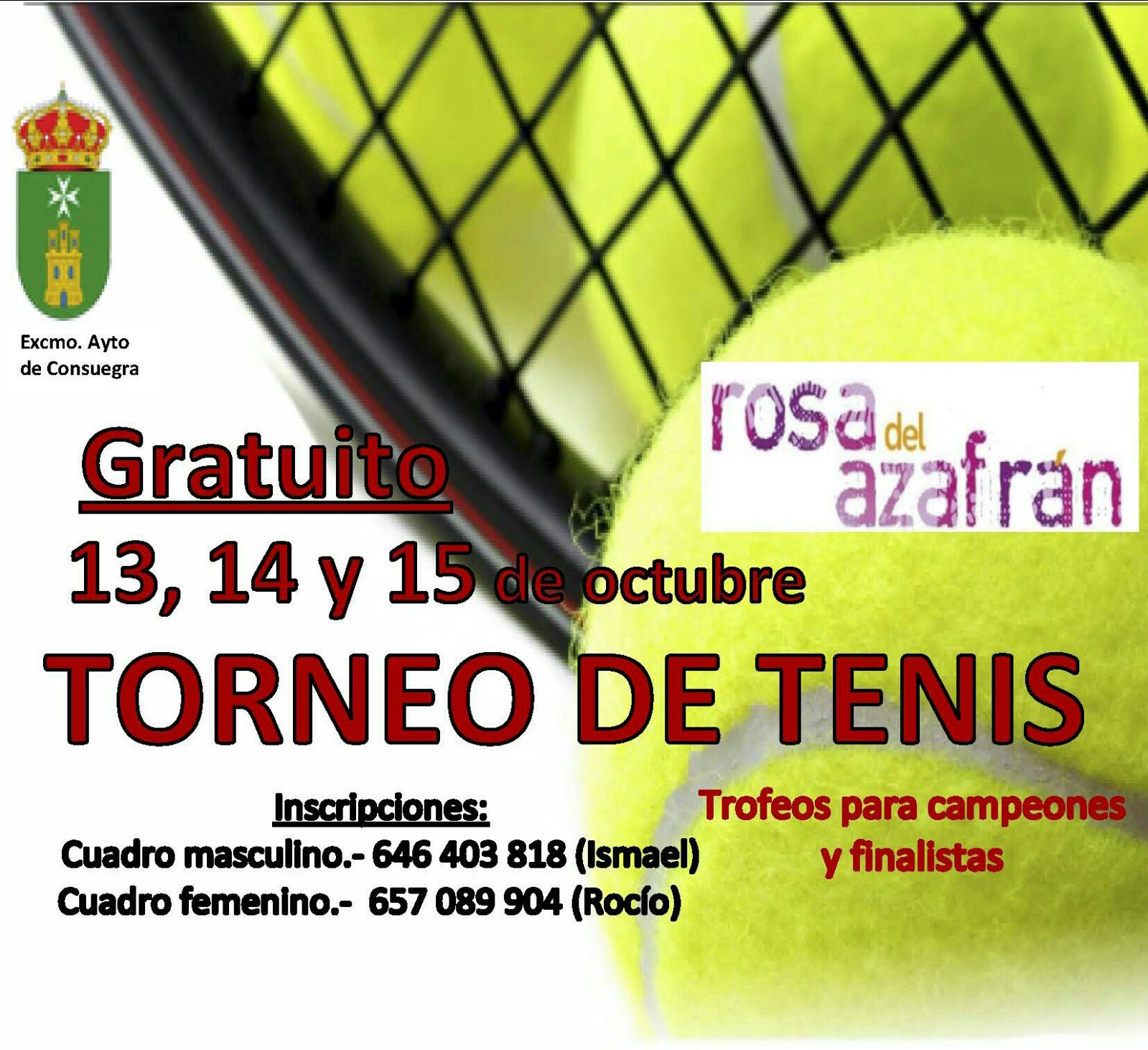 El Área Municipal de Deportes del Ayuntamiento de Consuegra organiza TORNEO DE TENIS «Rosa del Azafrán 2017», los días 13, 14 y 15 de octubre. Inscripciones: Cuadro masculino 646 403