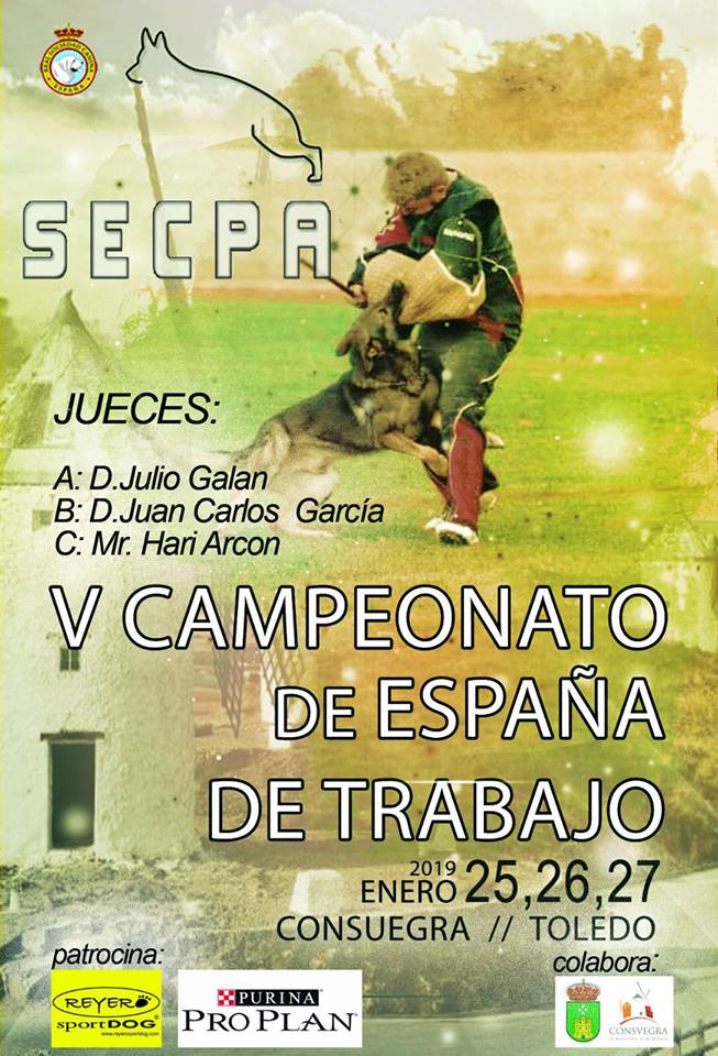 Del 25 al 27 de enero tendrá lugar en la ciudad de Consuegra el V CAMPEONATO DE ESPAÑA DE TRABAJO 2019, organizado por la Sociedad Española de Criadores de Pastor Alemán (SECPA), con la colaboración del Excmo. Ayuntamiento de Consuegra.