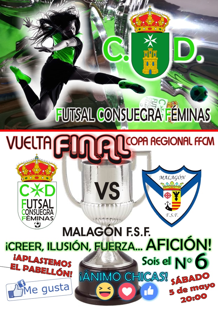 VUELTA FINAL COPA REGIONAL FFCM. TEMPORADA 2017/2018 C.D. FÚTSAL CONSUEGRA FÉMINAS vs U.D. MALAGON FSF Sábado, 5 de mayo, a las 20:00 horas. Pabellón Municipal de Consuegra Entrada: 1,50 € (exentos menores de 18
