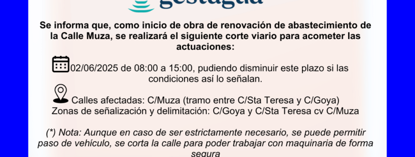 Se informa que, como inicio de obra de renovación de abastecimiento de la Calle Muza, se realizará el siguiente corte viario para acometer las actuaciones: