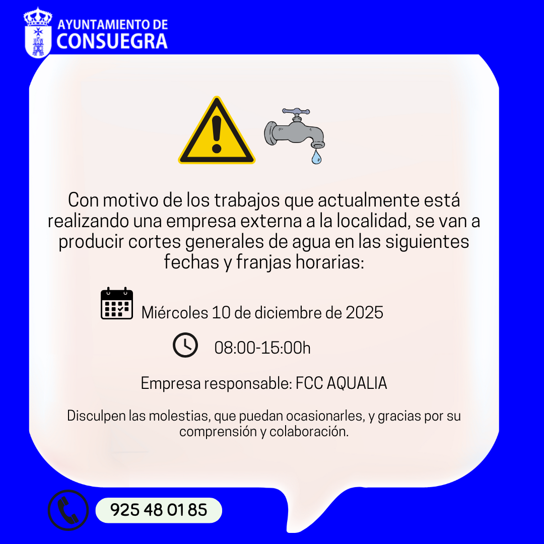 Con motivo de los trabajos que actualmente está realizando una empresa externa a la localidad, se van a producir cortes generales de agua en las siguientes fechas y franjas horarias: