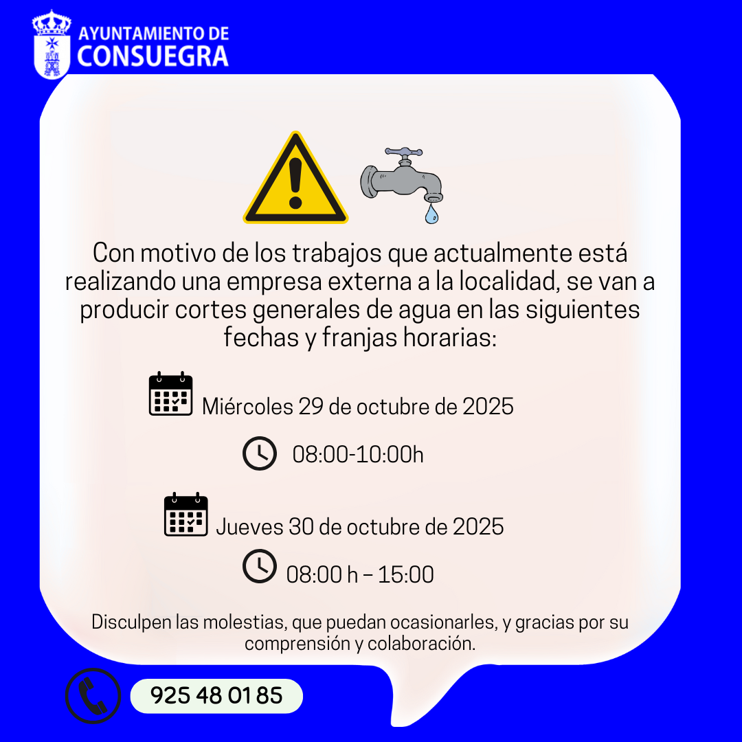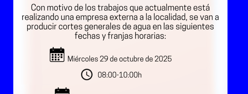 Con motivo de los trabajos que actualmente está realizando una empresa externa a la localidad, se van a producir cortes generales de agua en las siguientes fechas y franjas horarias: