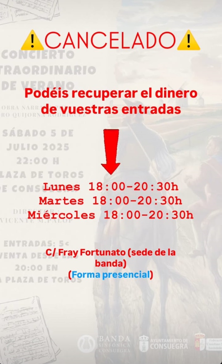 Todas aquellas personas que quieran recuperar el dinero de su entrada, podrán hacerlo de manera presencial el lunes 7, martes 8 y miércoles 9 de julio de 18:00 a 20:30, en la sede de la Banda (Convento de los Padres Franciscanos, C/ Fray Fortunato S/N, junto a la Residencia de Mayores).