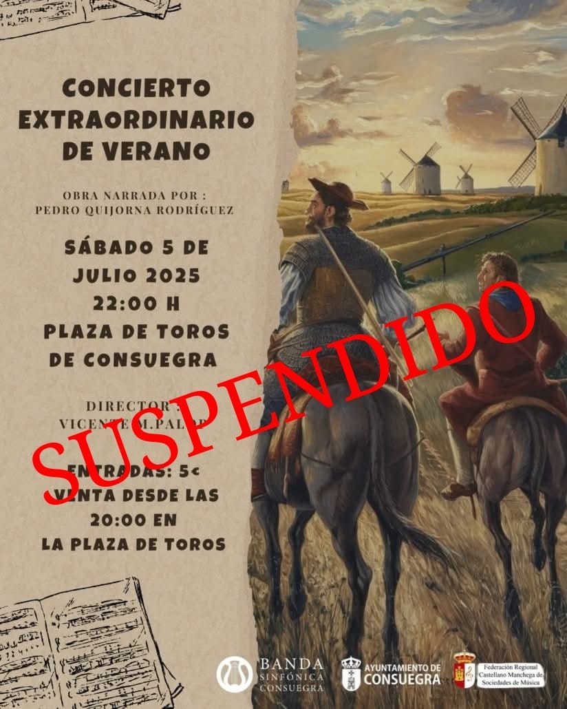 Lamentamos comunicar que por motivos logísticos el Concierto Extraordinario de Verano de la Banda Sinfónica de Consuegra ha sido definitivamente cancelado, por lo que no habrá nueva fecha para su realización.