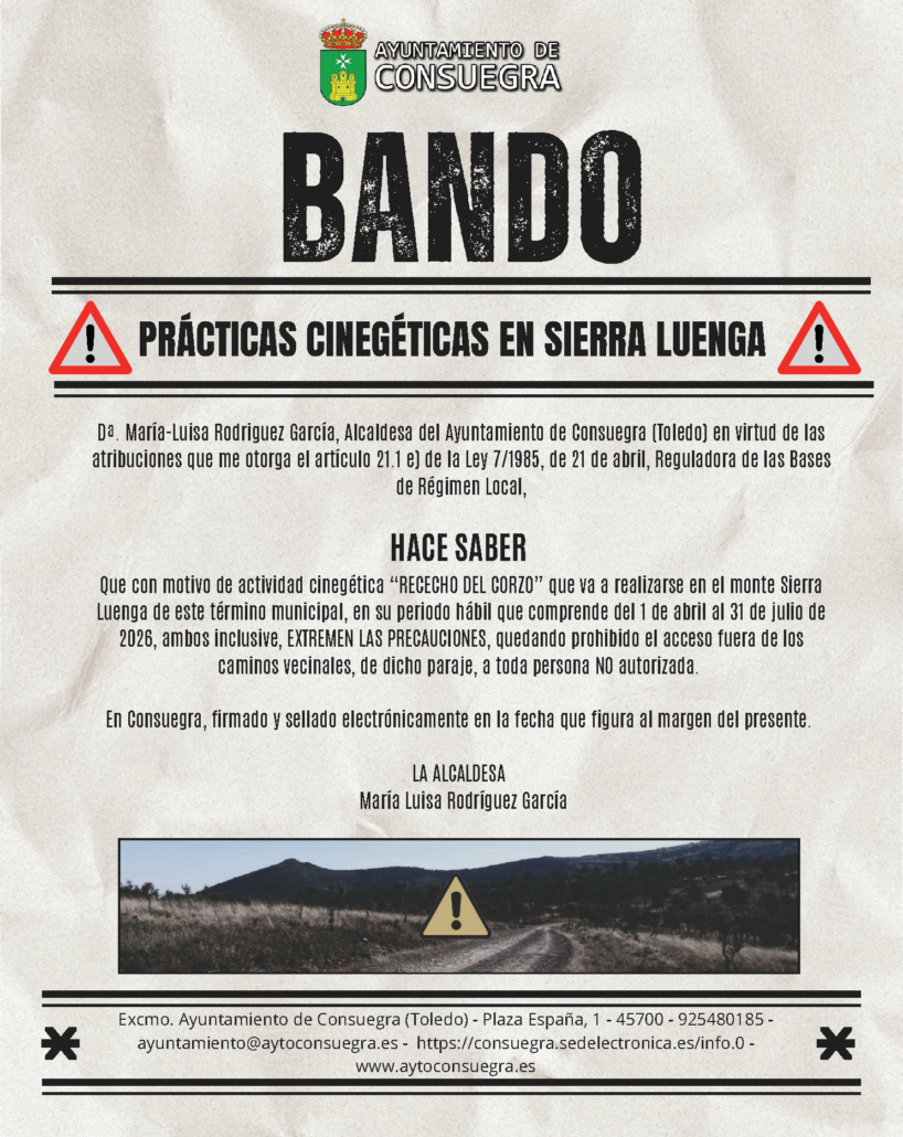 Se publica BANDO de Alcaldía por el que se comunica a la población las fechas que va a practicarse la actividad cinegética RECECHO DEL CORZO en monte público Sierra Luenga de Consuegra en el presente año de 2026.