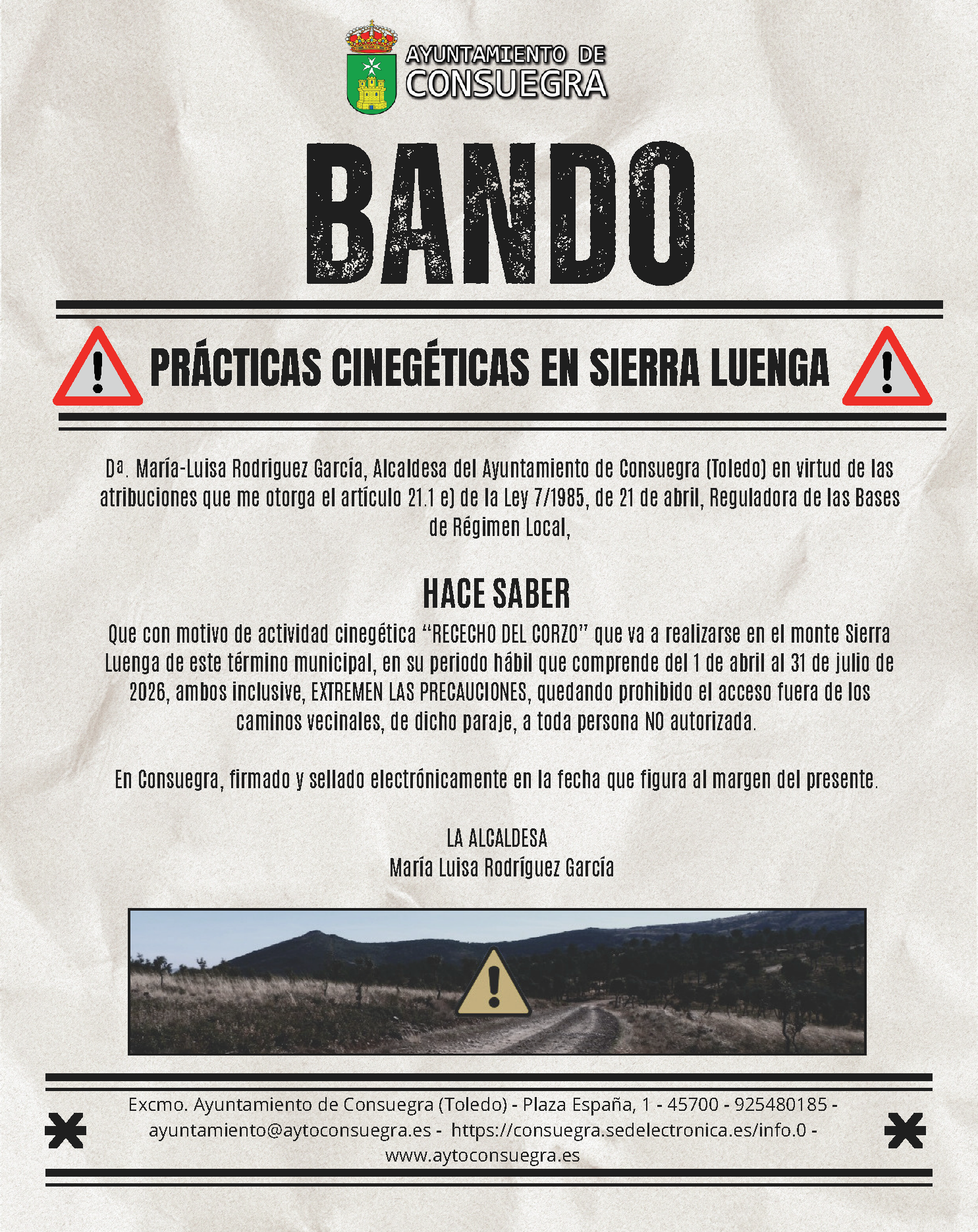 Se publica BANDO de Alcaldía por el que se comunica a la población las fechas que va a practicarse la actividad cinegética RECECHO DEL CORZO en monte público Sierra Luenga de Consuegra en el presente año de 2026.