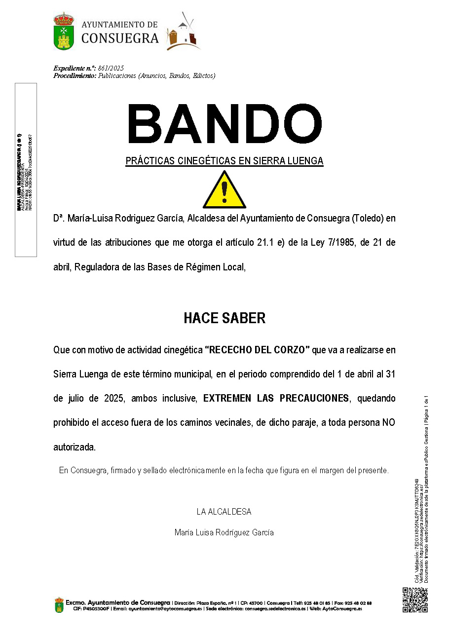 Se publica BANDO de Alcaldía por el que se comunica a la población las fechas que va a practicarse la actividad cinegética RECECHO DEL CORZO en monte público Sierraluenga de Consuegra en el presente año de 2025.