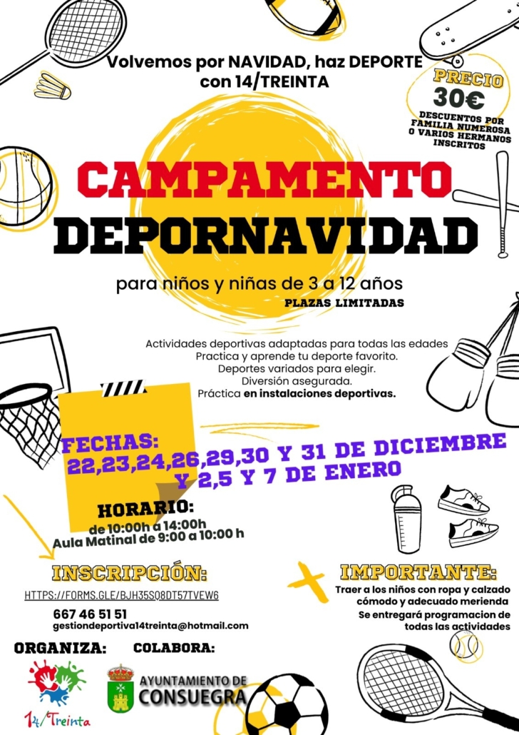 La Entidad Prestadora de Servicios a la Juventud 14/ TREINTA presenta en colaboración con el Excmo. Ayuntamiento de Consuegra, el Campamento DEPORNAVIDAD, para los más pequeños.
