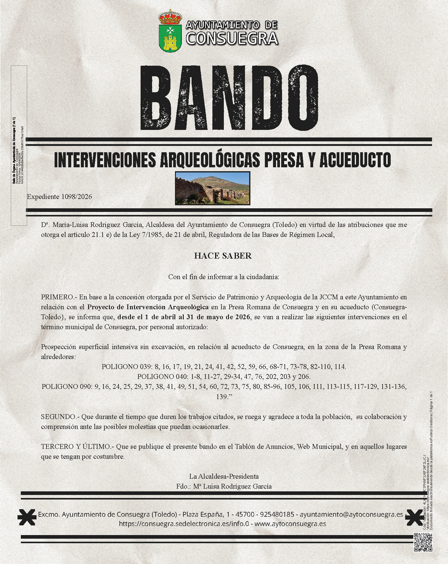 Se comunica a través del siguiente BANDO que se han iniciado las prospecciones arqueológicas (del 1 de abril al 31 de mayo 2026) en zonas próximas a la Presa y Acueducto de Consuegra.