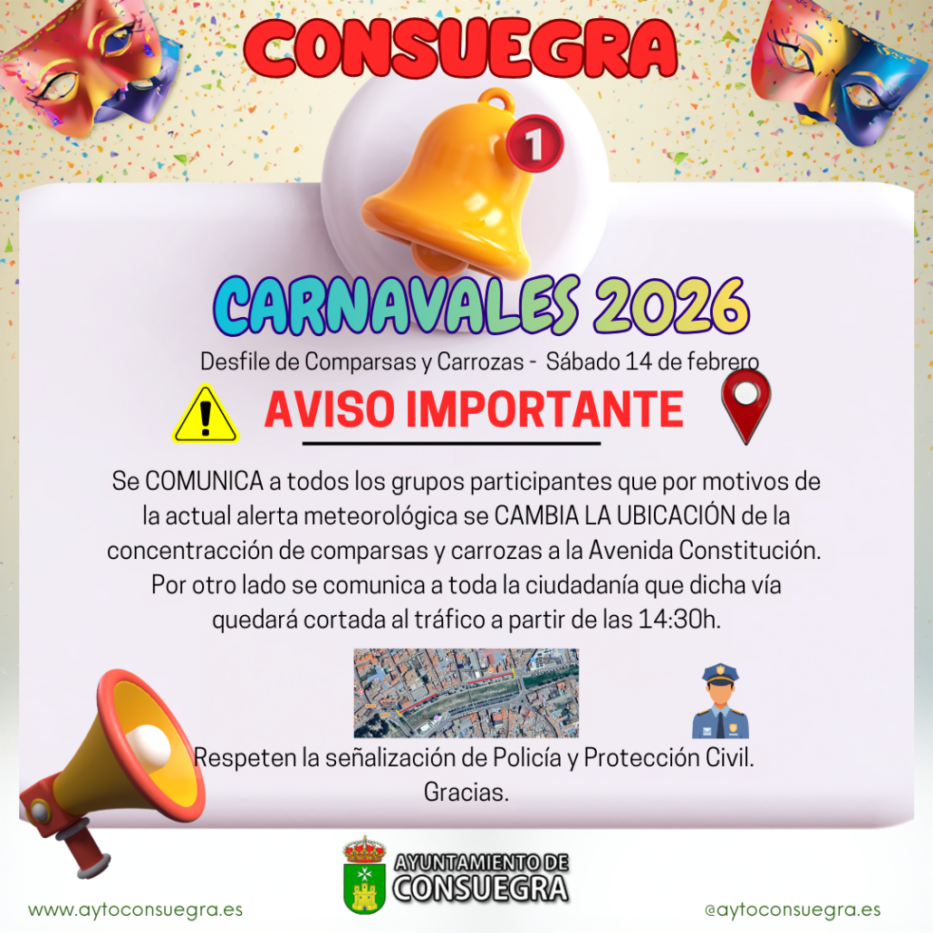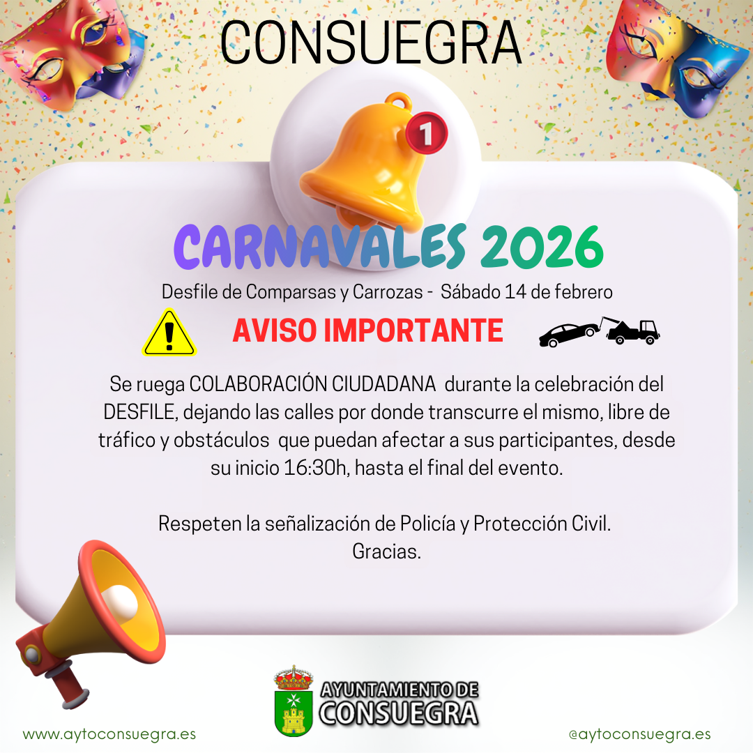 | CONSUEGRA. CARNAVALES 2026 AVISO IMPORTANTE Se ruega COLABORACIÓN CIUDADANA durante la celebración del DESFILE, dejando las calles por donde transcurre el mismo, libre de tráfico y obstáculos que puedan afectar a sus participantes, desde su inicio 16:30h, hasta el final del evento. Respeten la señalización de Policía y Protección Civil. Gracias |