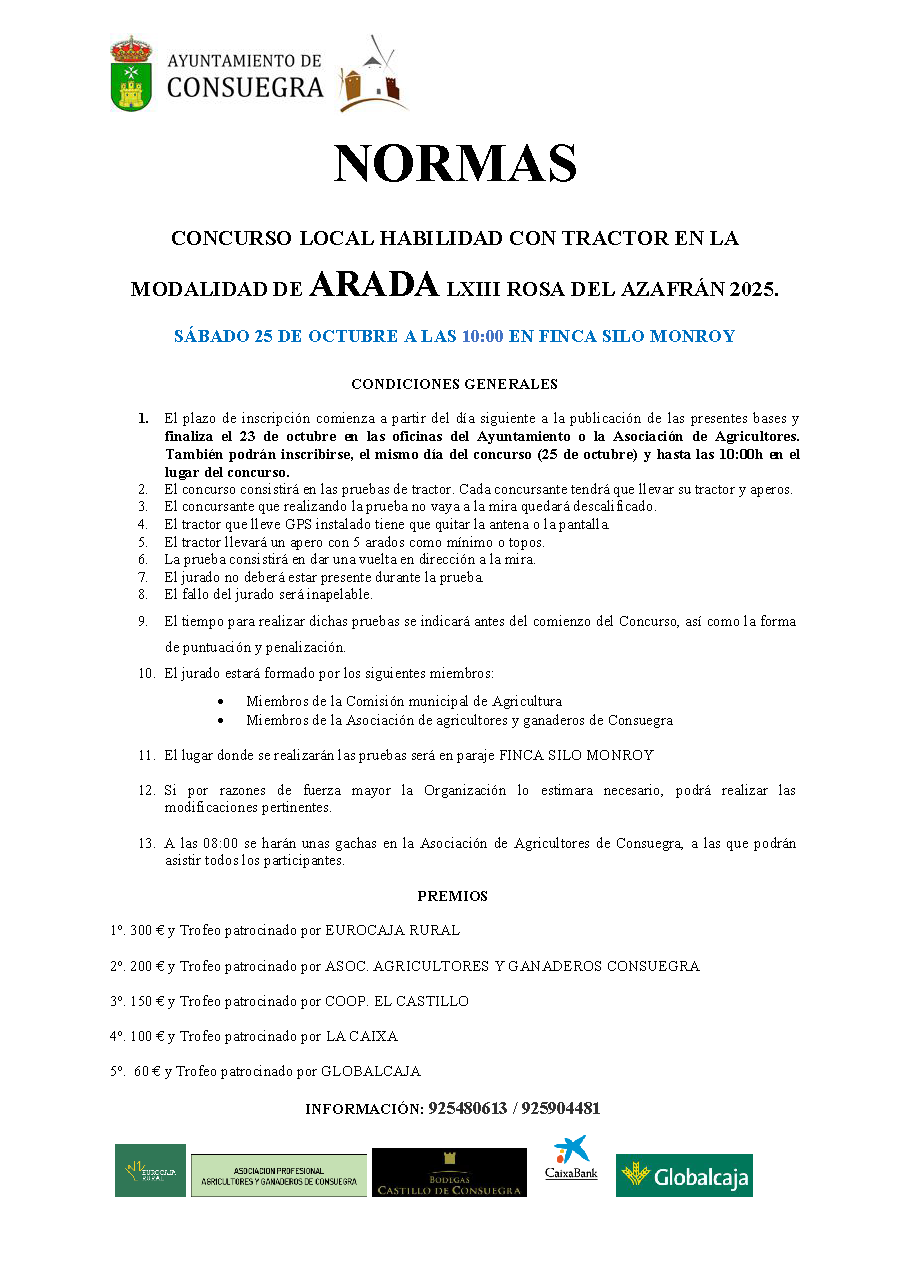 Normas concurso habilidad con tractor. ARADA. Rosa del Azafrán 2025