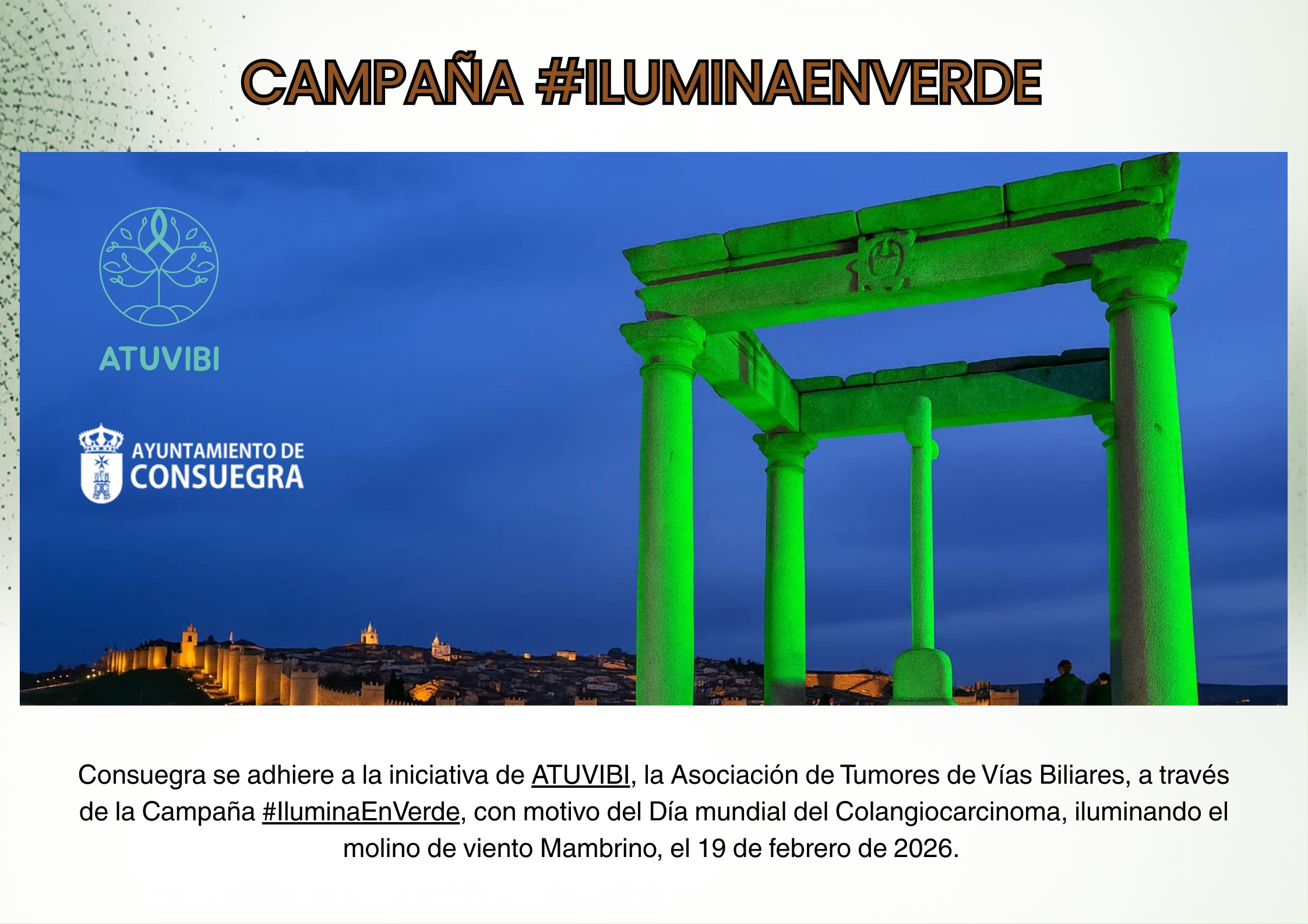 El Ayuntamiento de Consuegra con motivo del Día Mundial del Colangiocarcinoma, el próximo 19 de febrero, el Molino de Viento MAMBRINO se iluminará de verde, en apoyo a la Asociación ATUVIBI