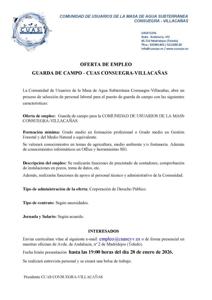 La Comunidad de Usuarios de la Masa de Agua Subterránea Consuegra-Villacañas necesita cubrir los siguientes puestos:
