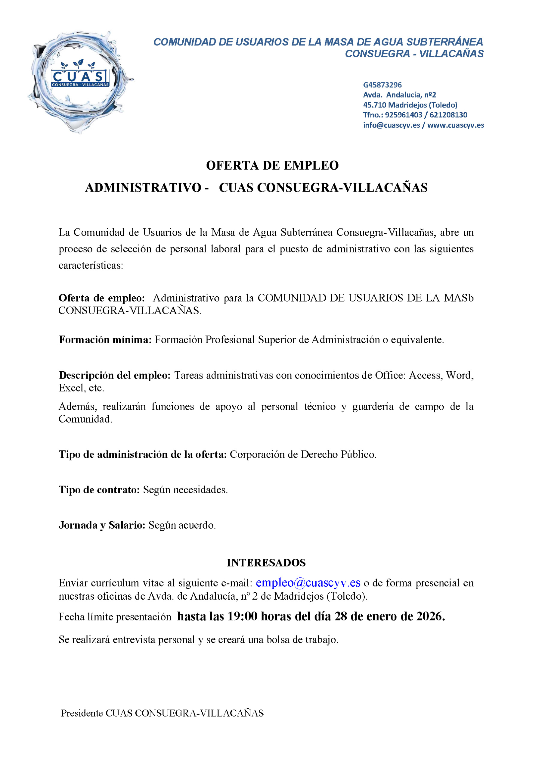 La Comunidad de Usuarios de la Masa de Agua Subterránea Consuegra-Villacañas necesita cubrir los siguientes puestos: