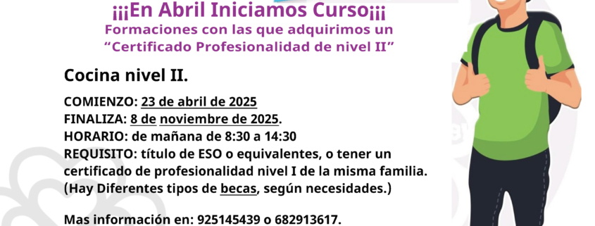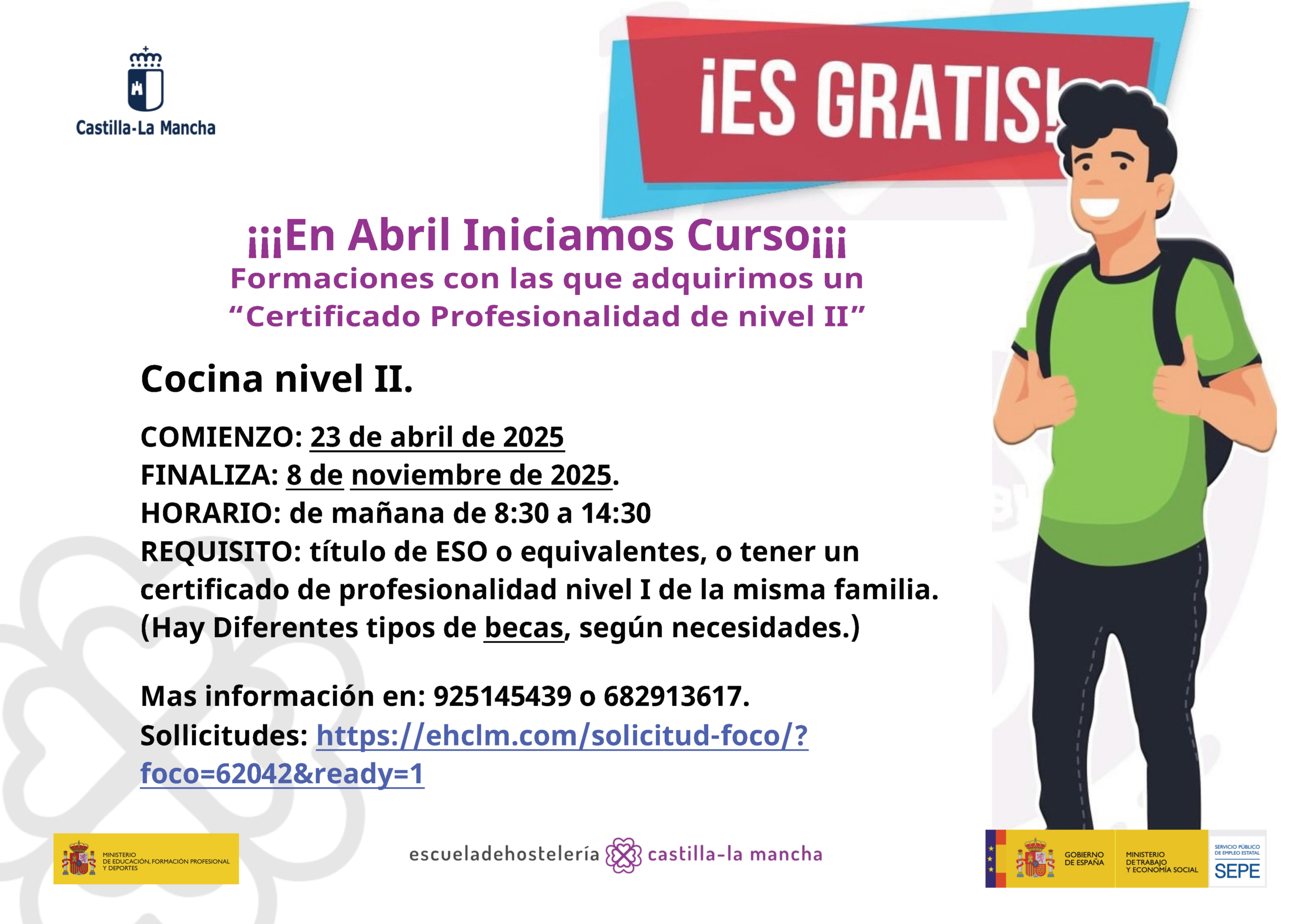 - Requisitos: Título de ESO o equivalentes, o tener un certificado de profesionalidad nivel I de la misma familia. (Hay Diferentes tipos de becas, según necesidades.)